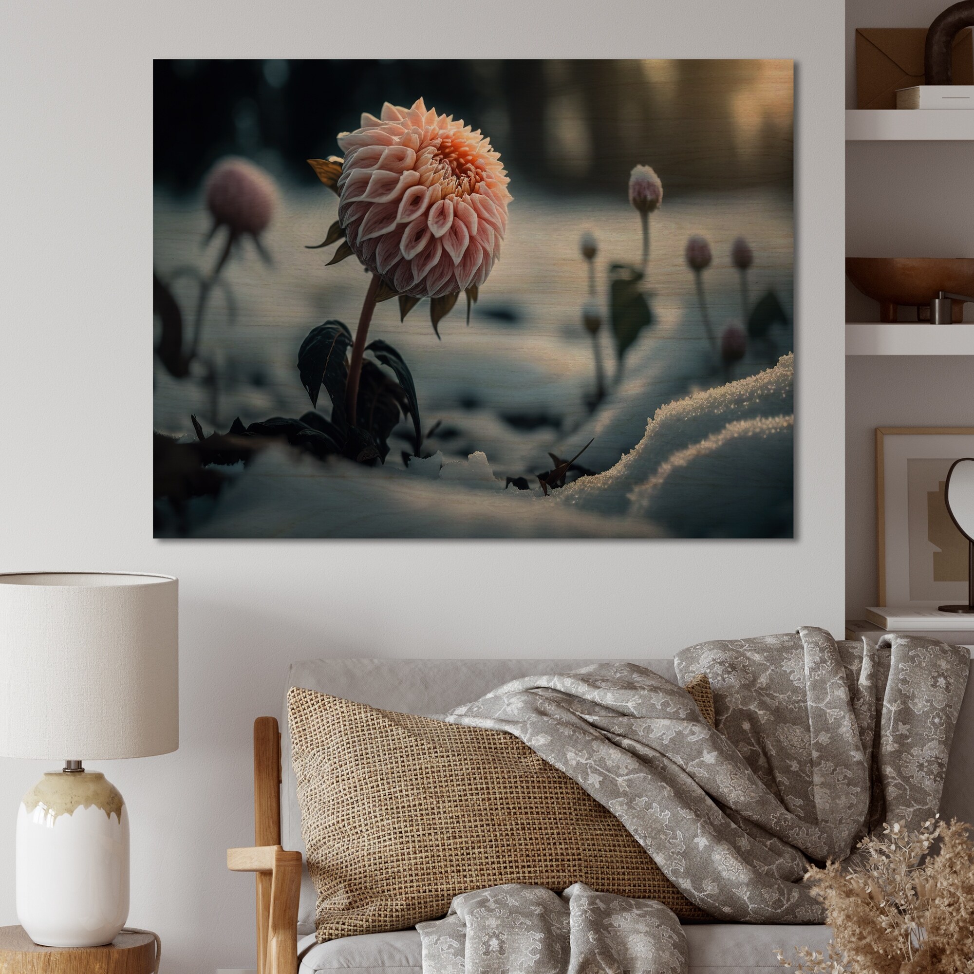 Designart 'A Blooming Pink Dahlia Flower in Winter I' Floral Dahlia Wood Wall Art - Natural Pine Wood