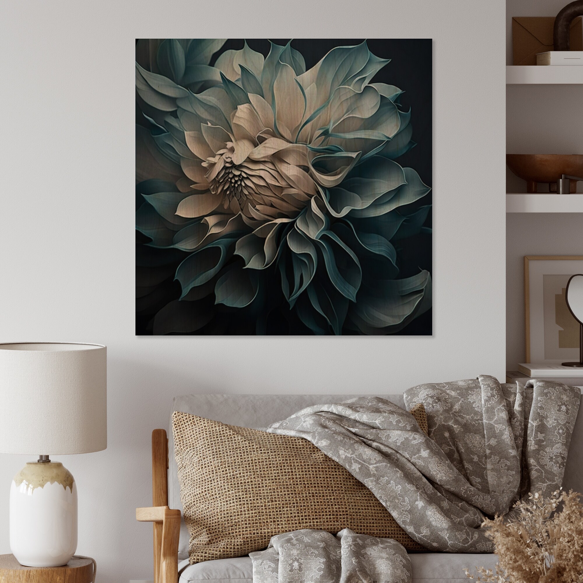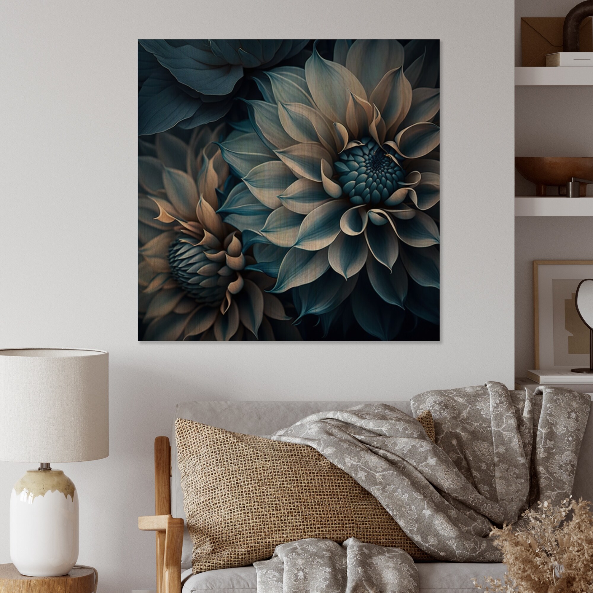 Designart 'Blue And White Dahlia Flowers I' Floral Dahlia Wood Wall Art - Natural Pine Wood