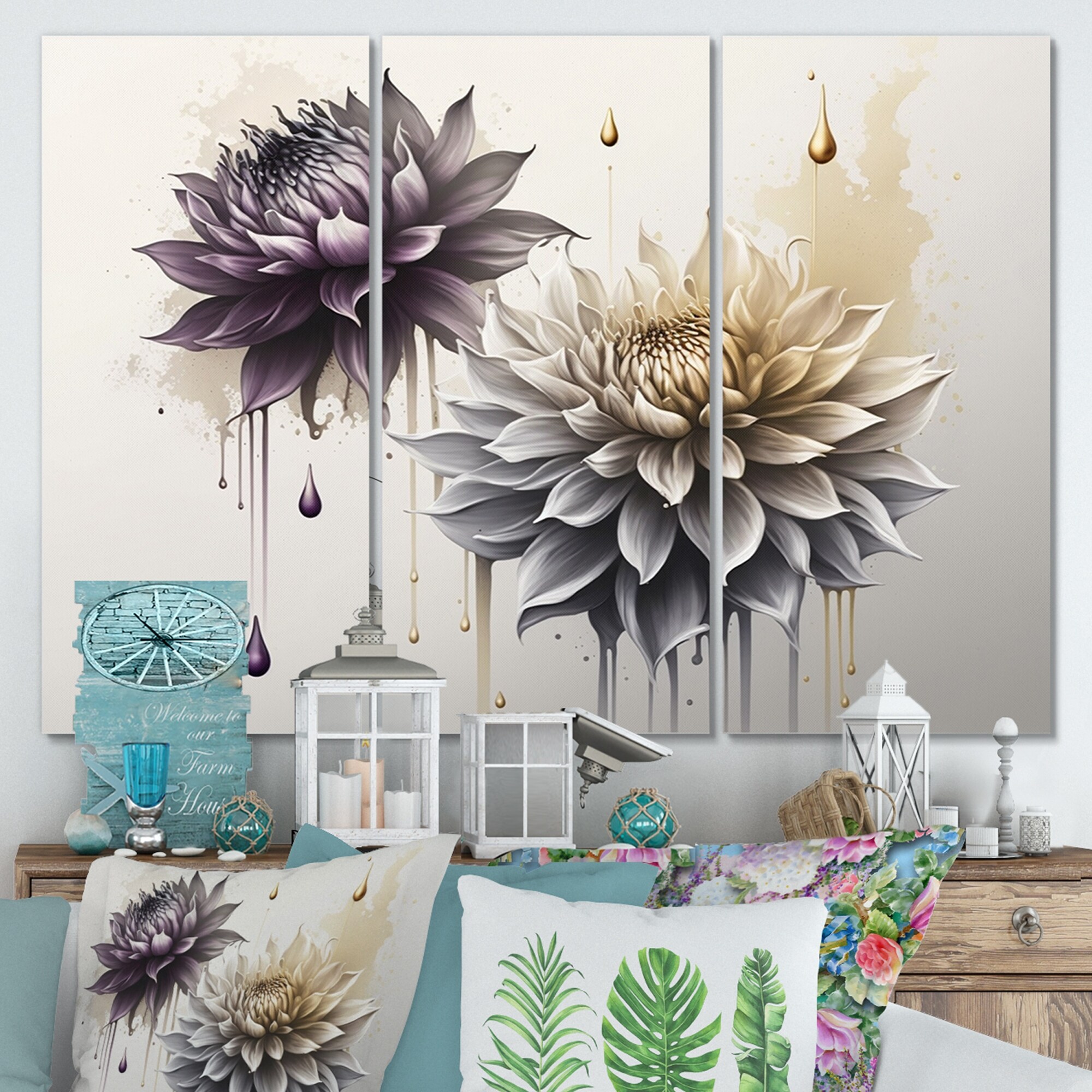 Designart "Blue And White Dahlia Flowers I" Floral Dahlia Framed Canvas Art Print - 3 Panels