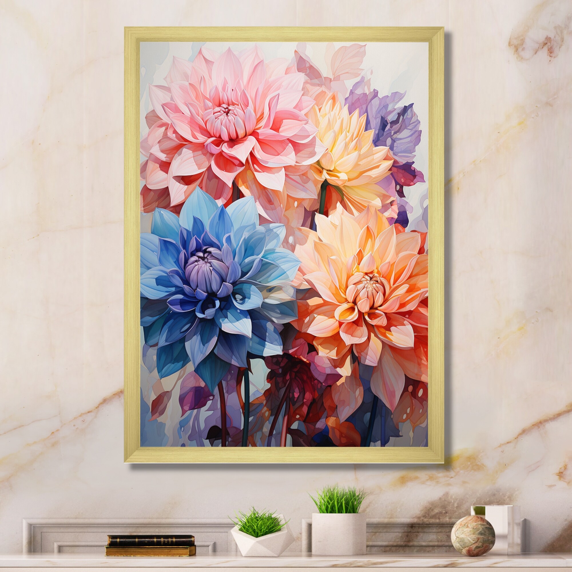 Designart "Blue And Gold Dahlia Bunch II" Floral & Botanical Framed Canvas Art Print