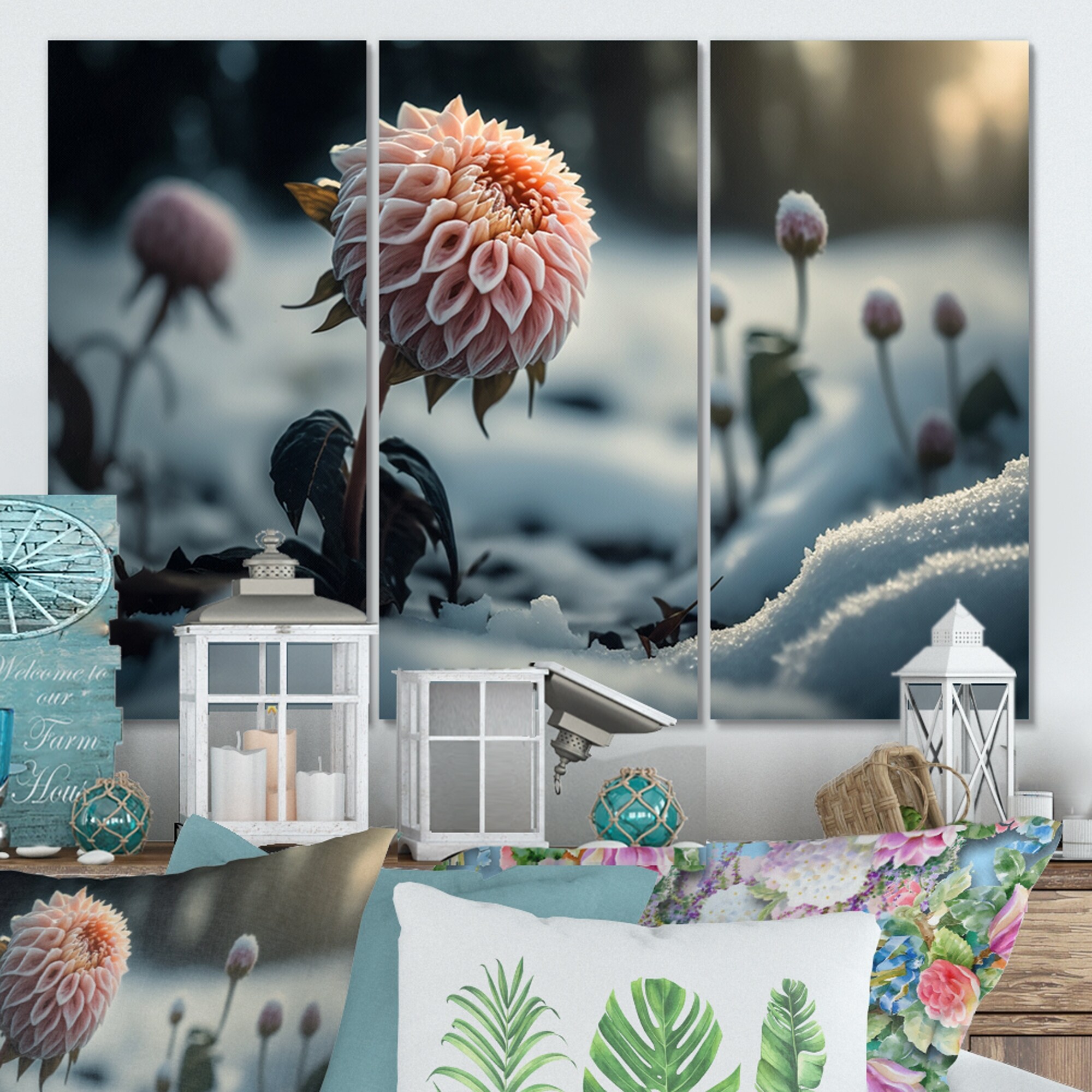 Designart "A Blooming Pink Dahlia Flower in Winter I" Floral Dahlia Canvas Art Print - 3 Panels