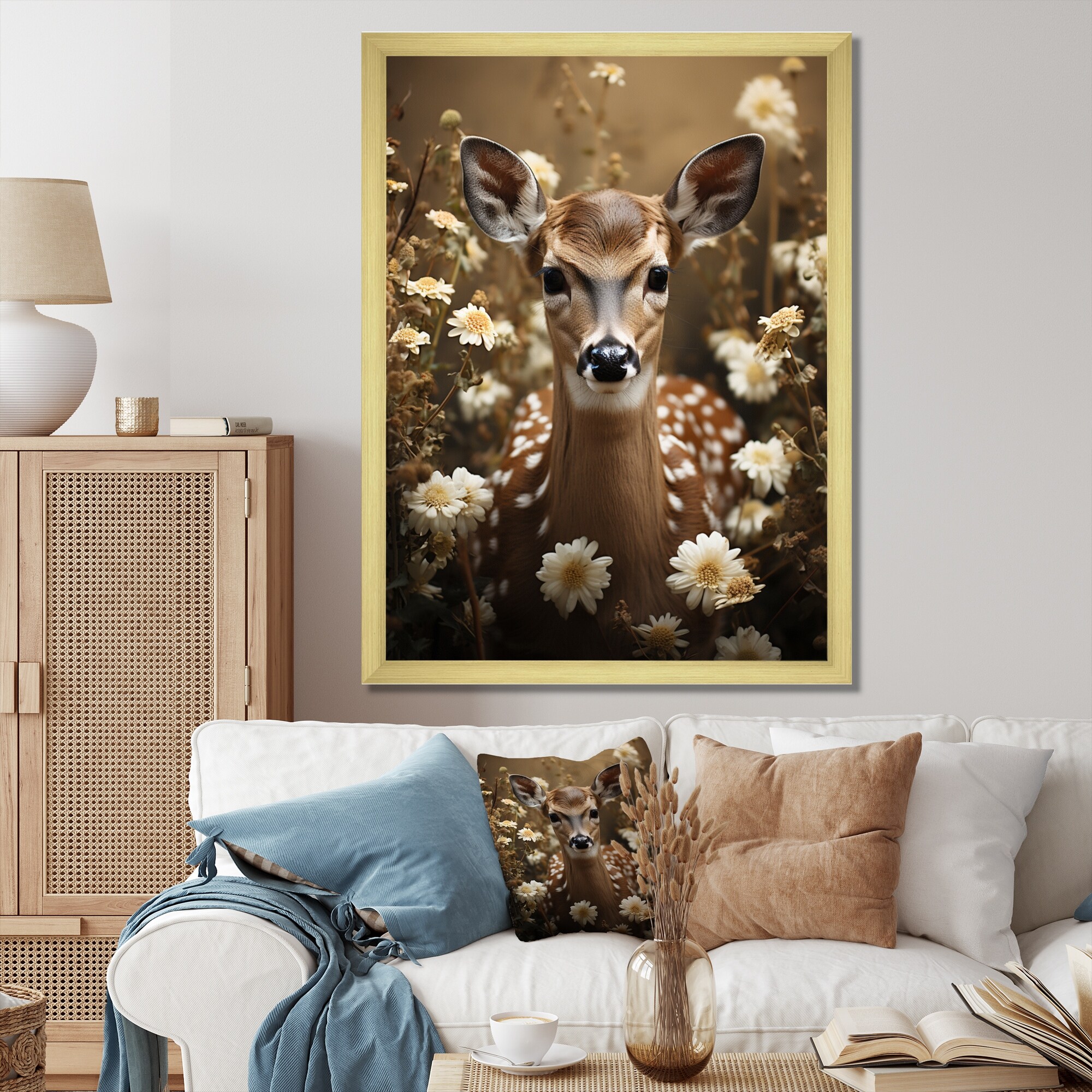 Designart "Deer Cub in Flowers Decor" Traditional Framed Art Print
