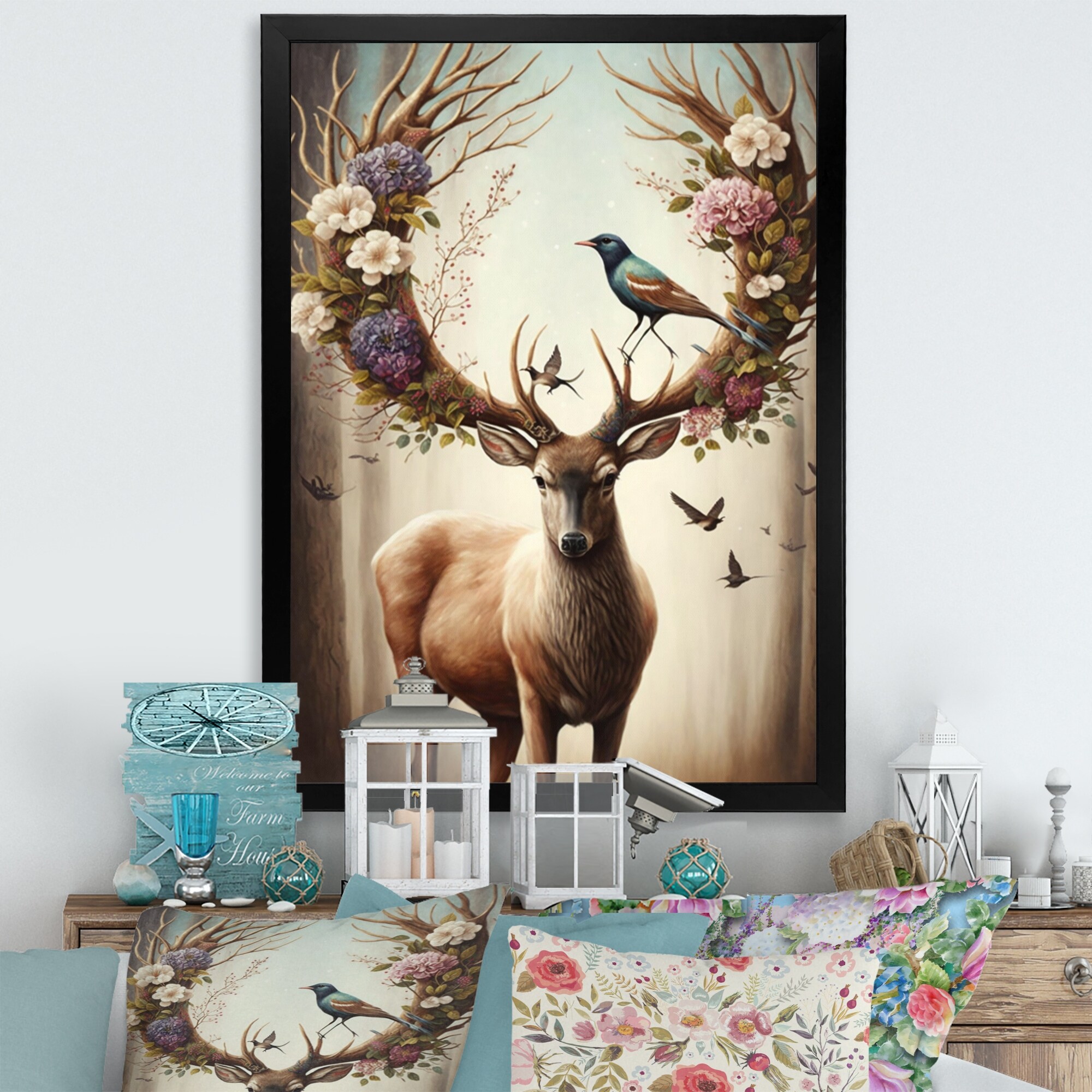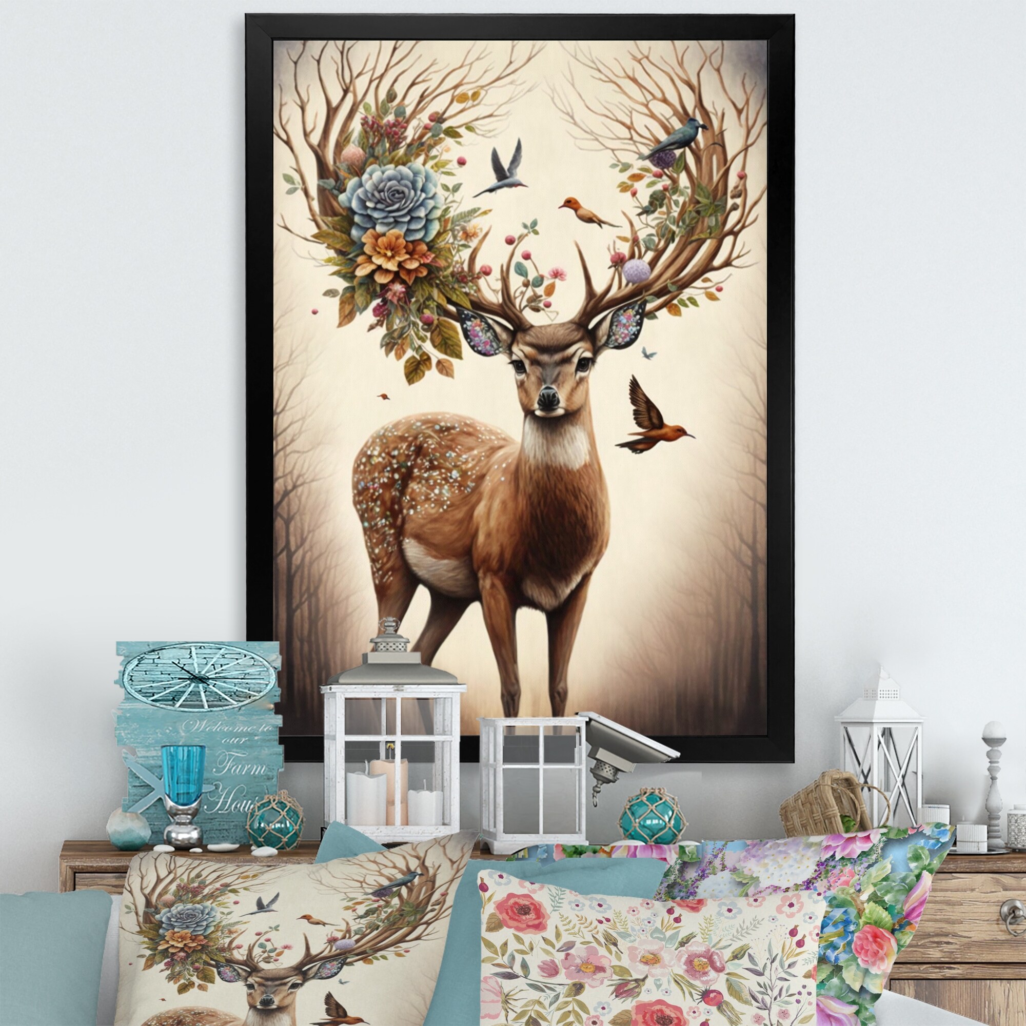 Designart "Deer With Blooming Antlers II" Animals Framed Art Print