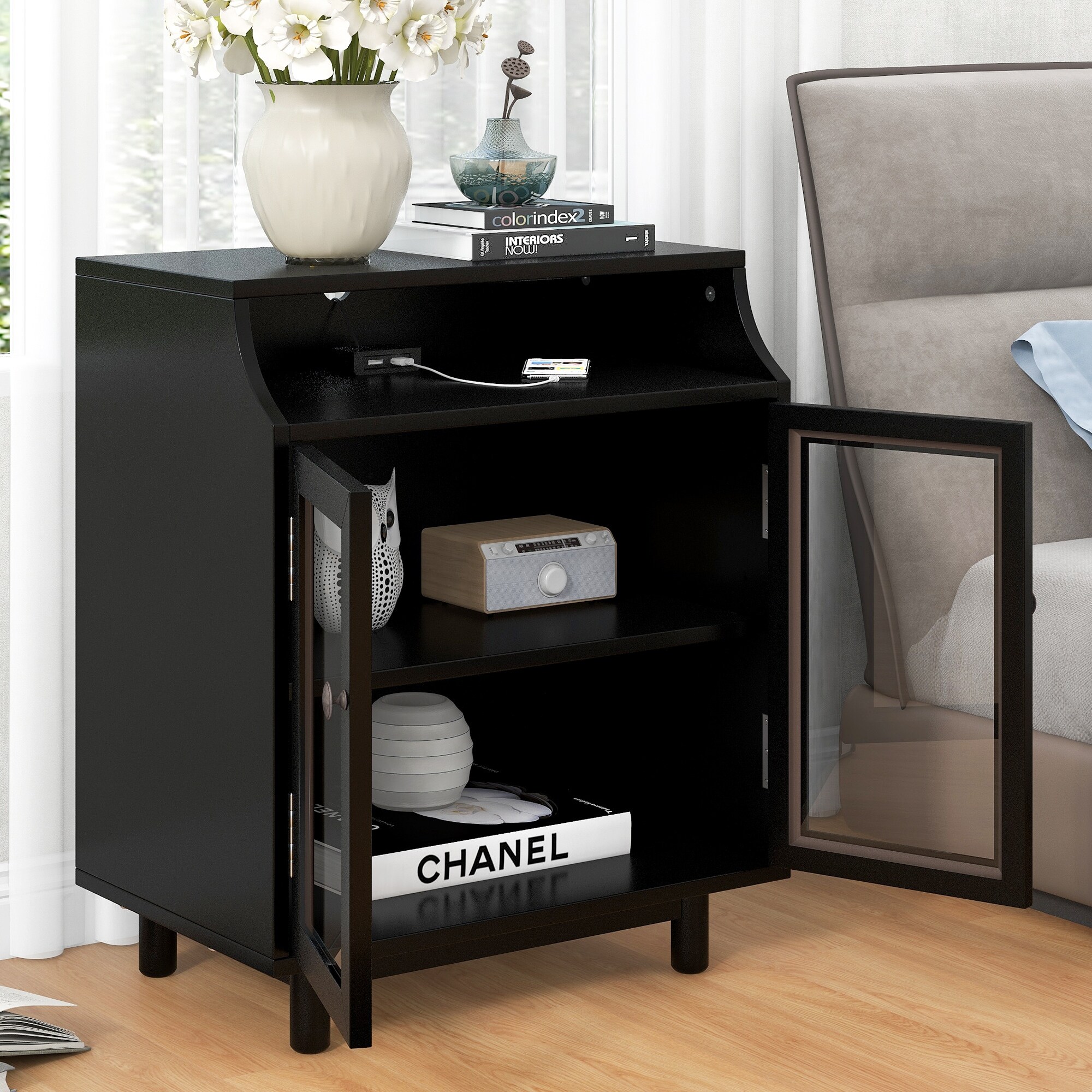 Nightstand with Glass Door,USB Design