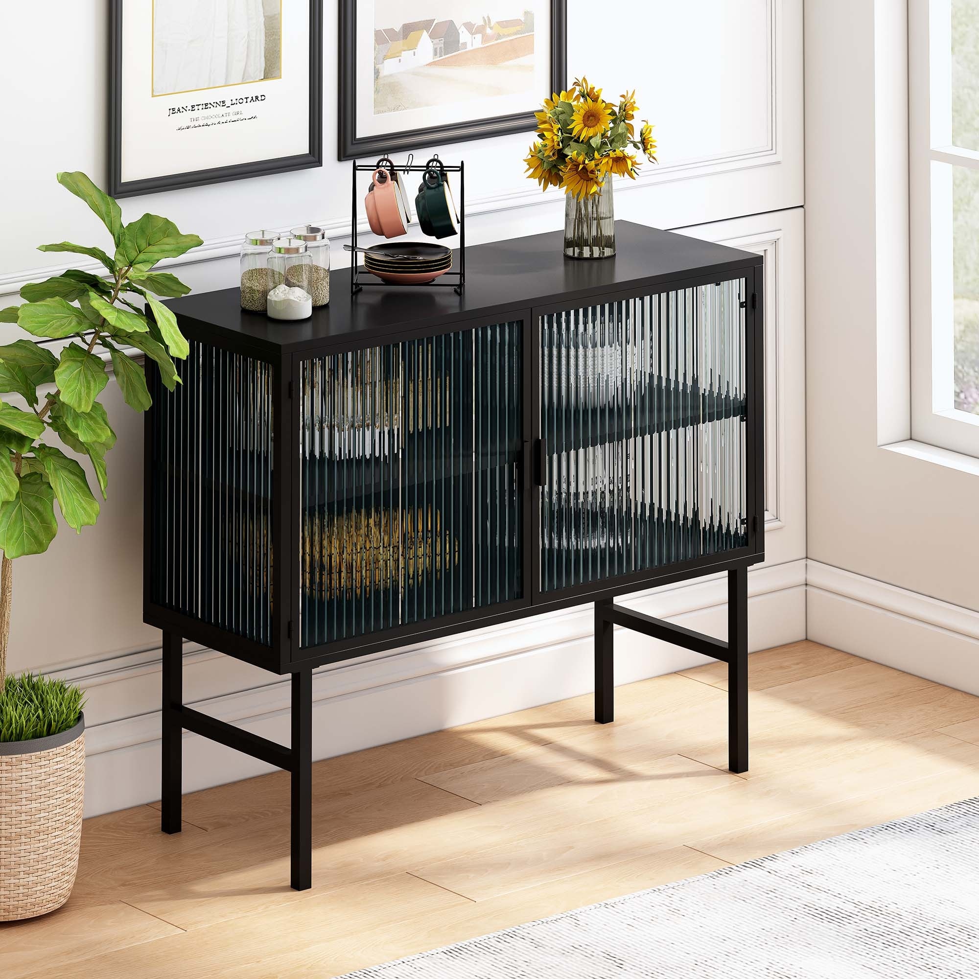 Sideboard with Glass Doors with Silver Handle and 2 Adjustable Shelves for Dining Room, Black