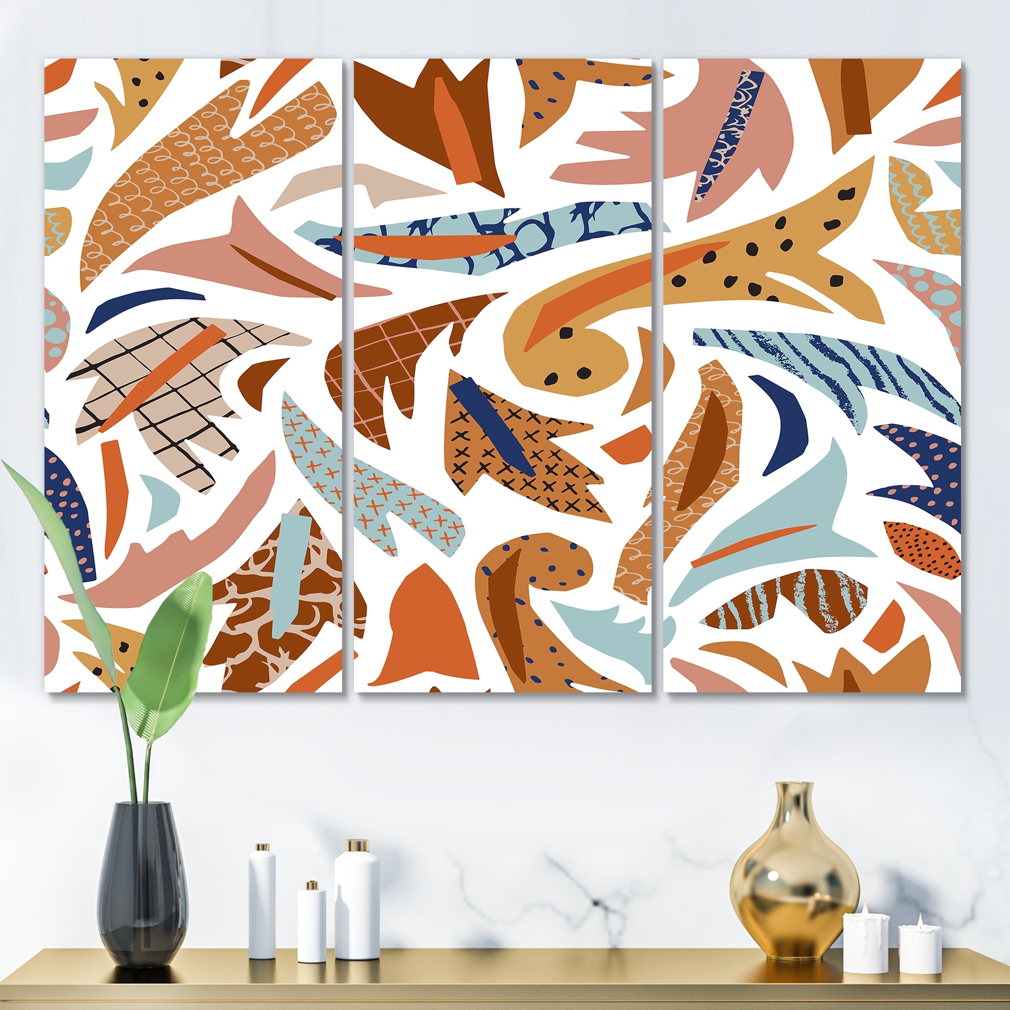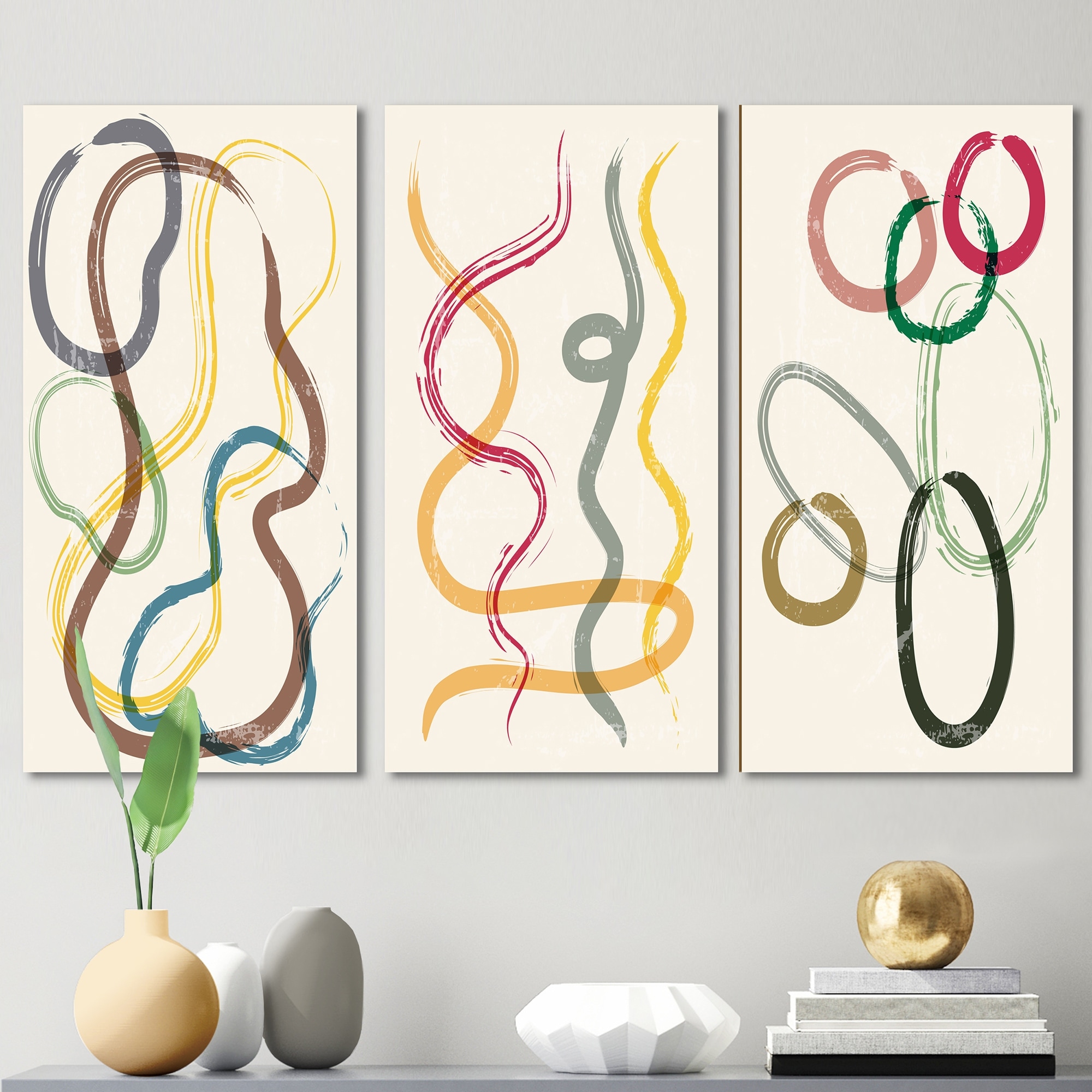 Designart 'Grunge Abstract Minimal Colorful Doodles I' Mid-Century Modern Art Set of 3 Pieces