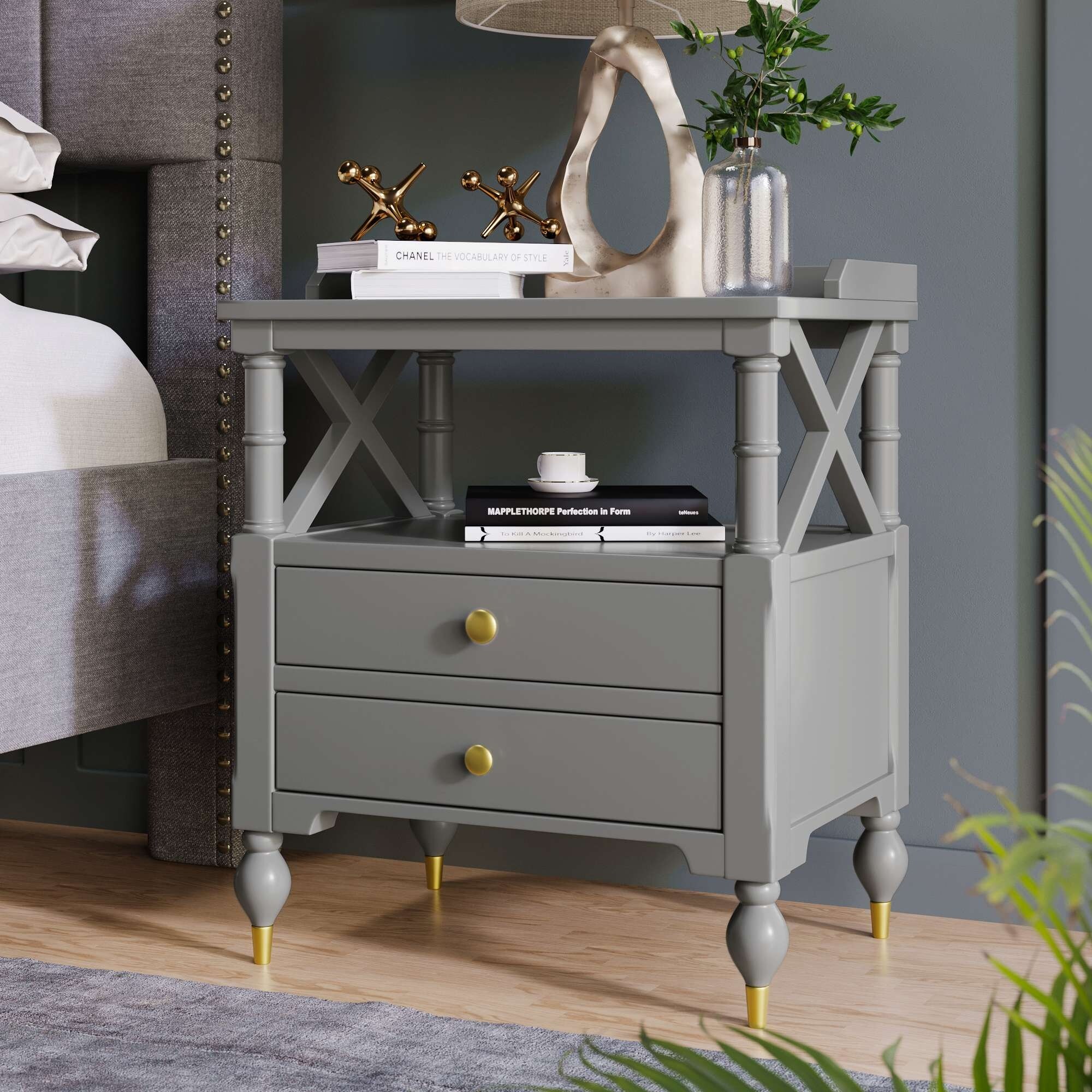 Wooden Two Drawer Nightstand with Bracket Legs, Gray