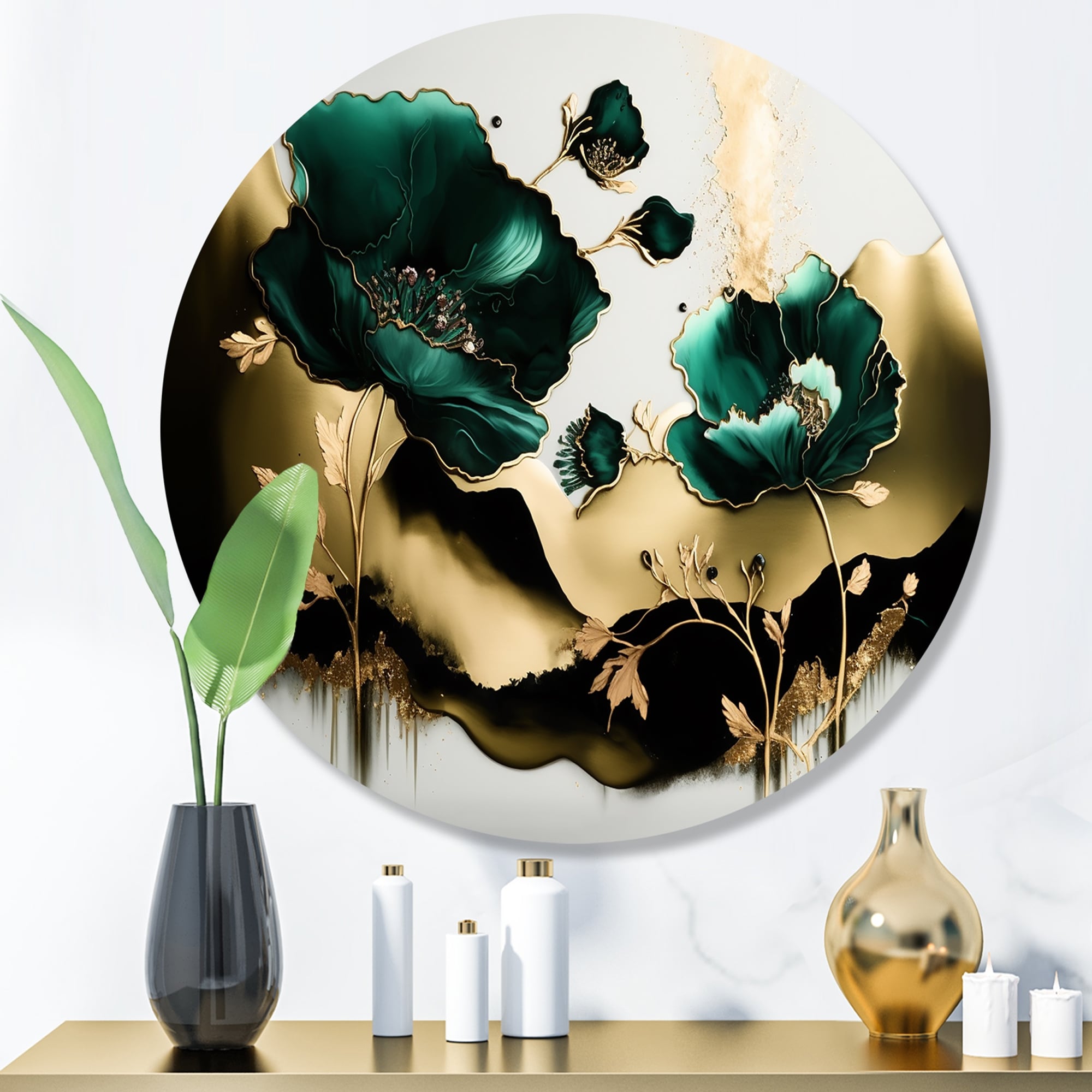 Designart "Gold And Green Poppy Floral Euphoria II" Floral Poppy Metal Round Wall Art