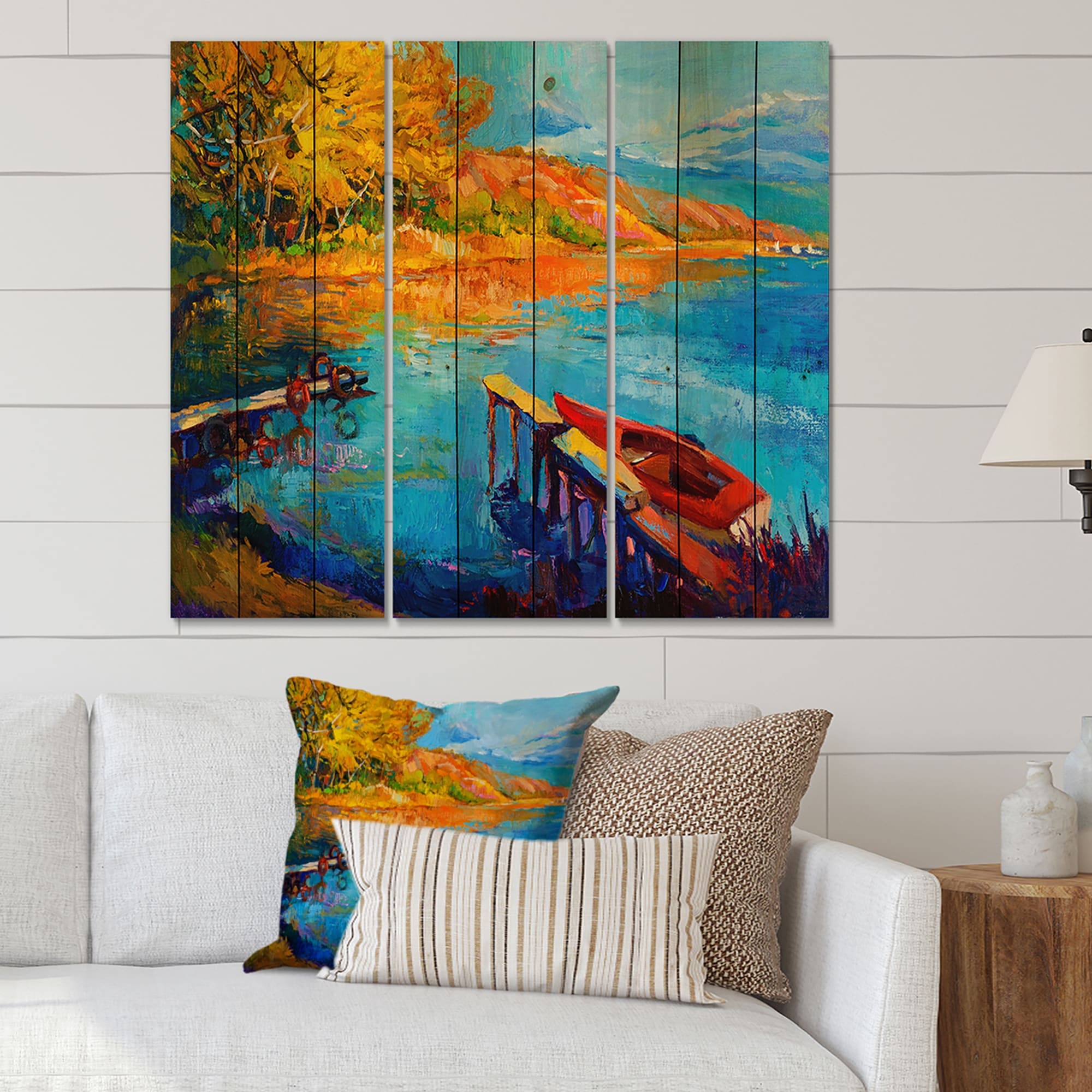 Designart 'Sunset Evening Glow At the Lake II' Lake House Print on Natural Pine Wood - 3 Panels