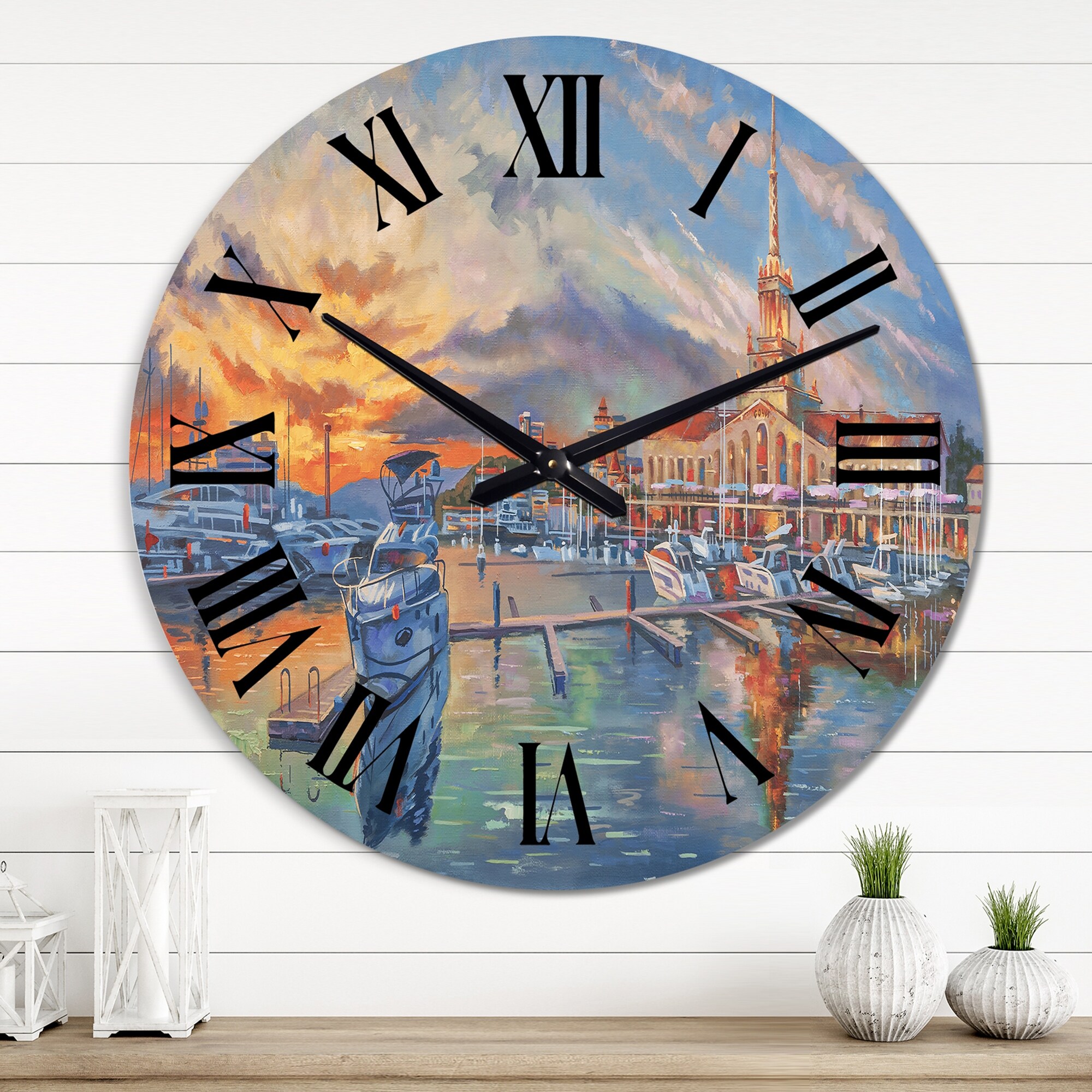 Designart 'Evening In the Seaport' Nautical & Coastal wall clock