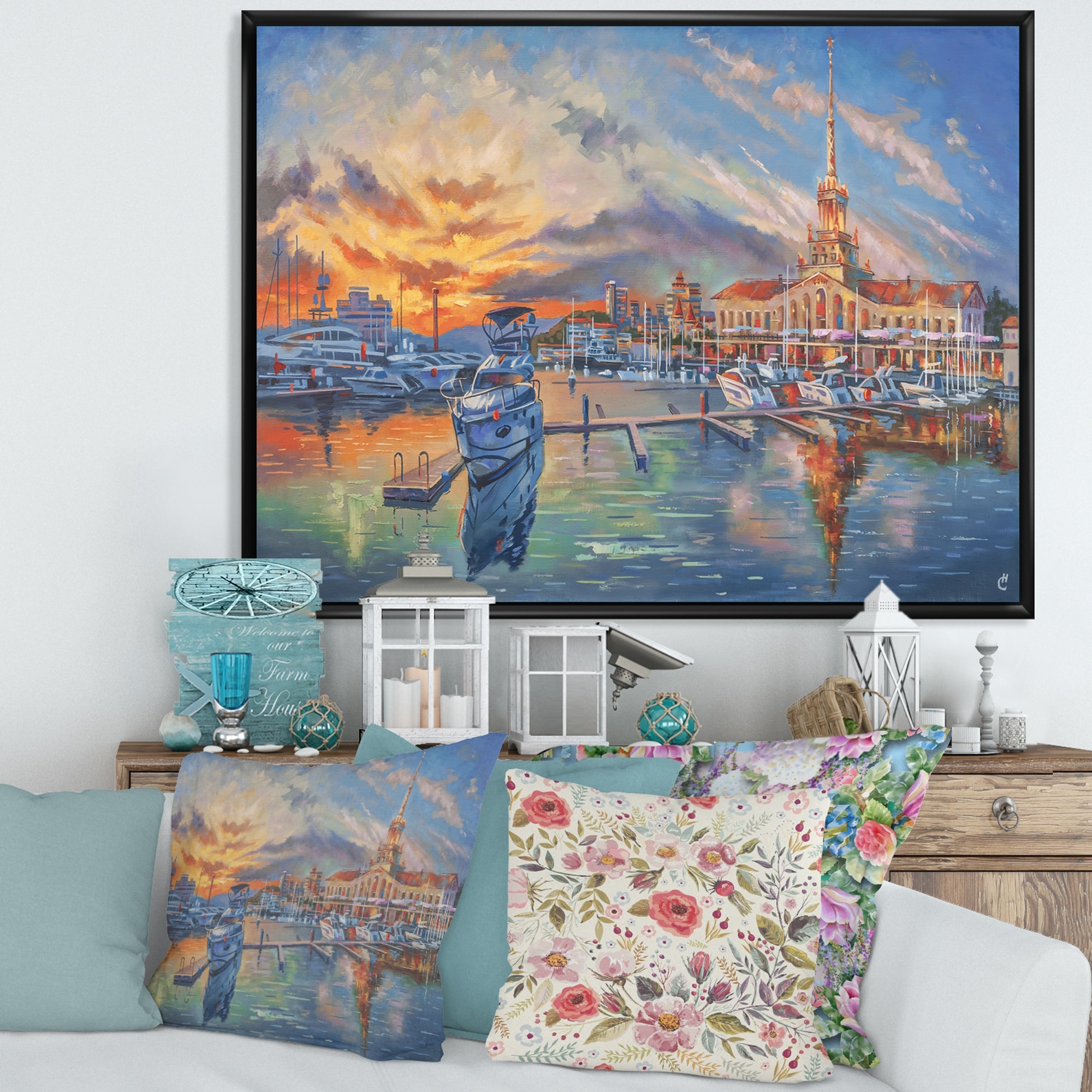 Designart "Evening In the Seaport" Nautical & Coastal Framed Canvas Wall Art Print