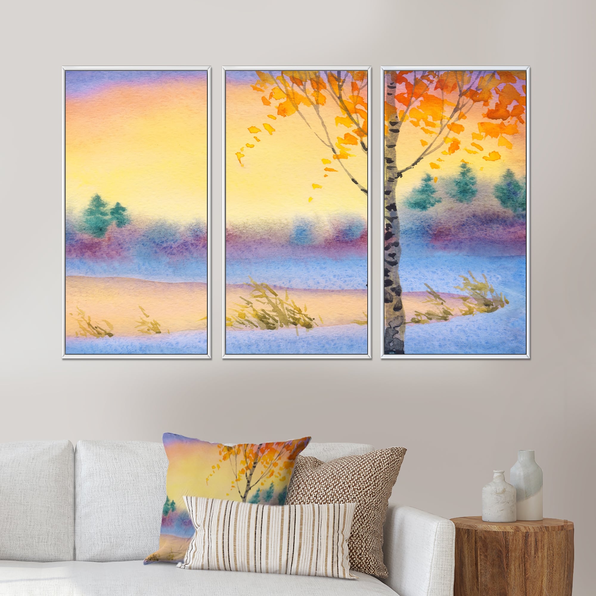 Designart "Winter Landscape Evening Sky Over Lake" Traditional Framed Canvas Wall Art Set of 3 - 4 Colors of Frames
