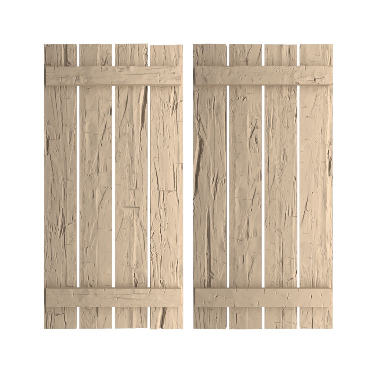 Rustic Four Board Joined Board-n-Batten Faux Wood Shutters w/End Batten (Per Pair), Primed Tan
