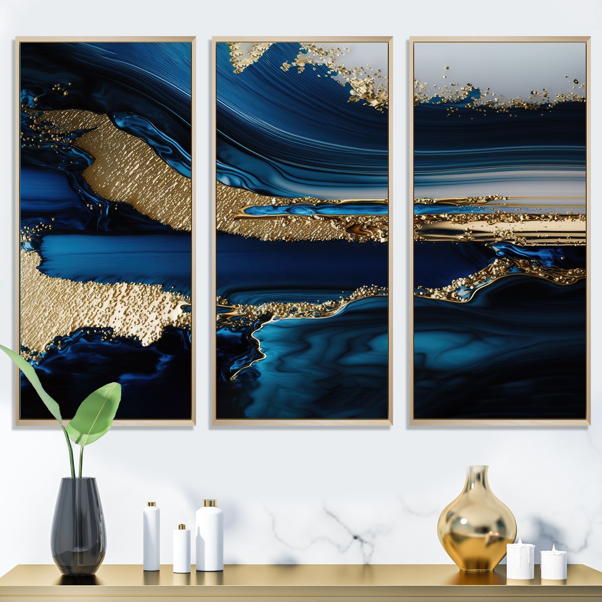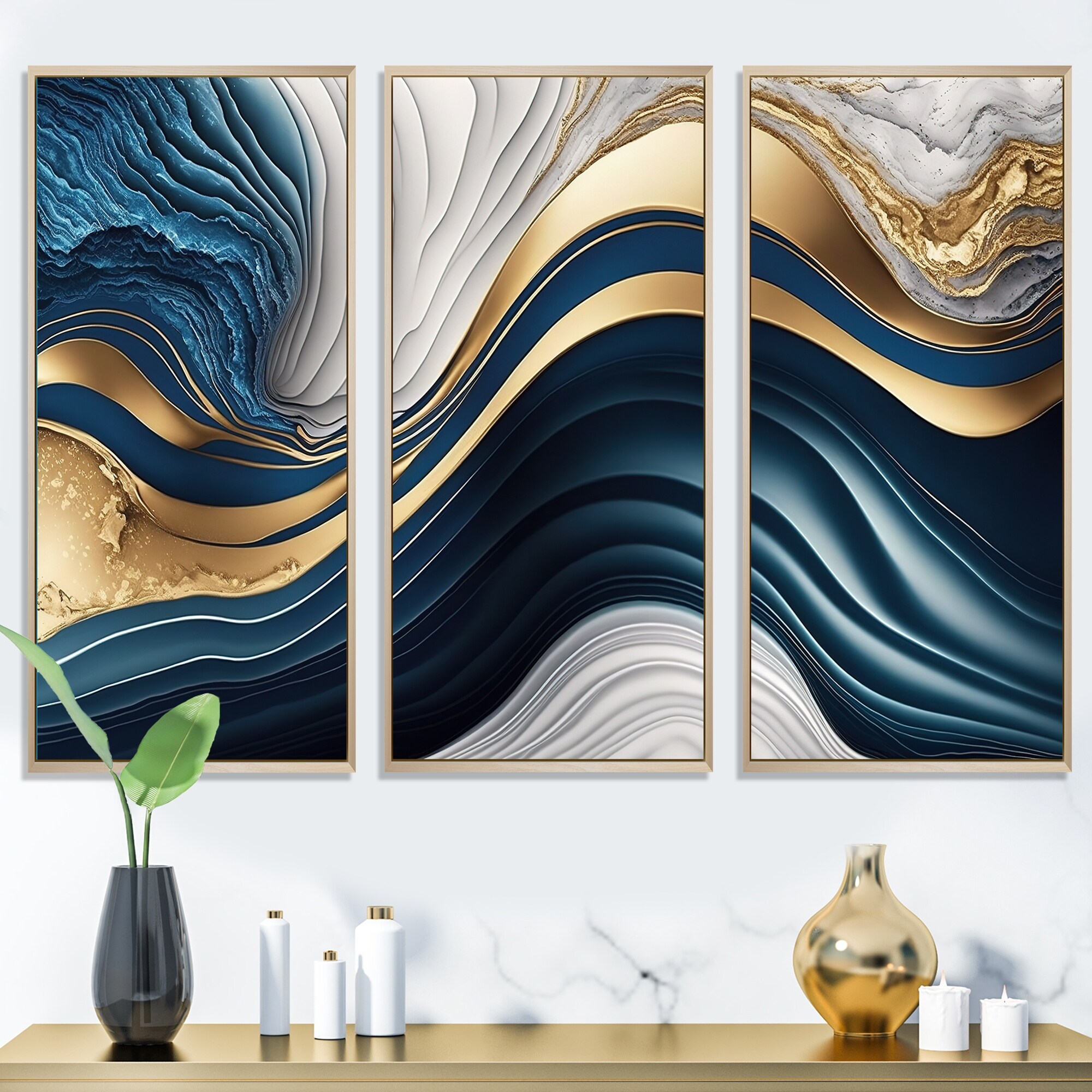 Designart "Abstract Geode Waves Blue I" Modern Waves Framed Canvas Art Print - 3 Panels