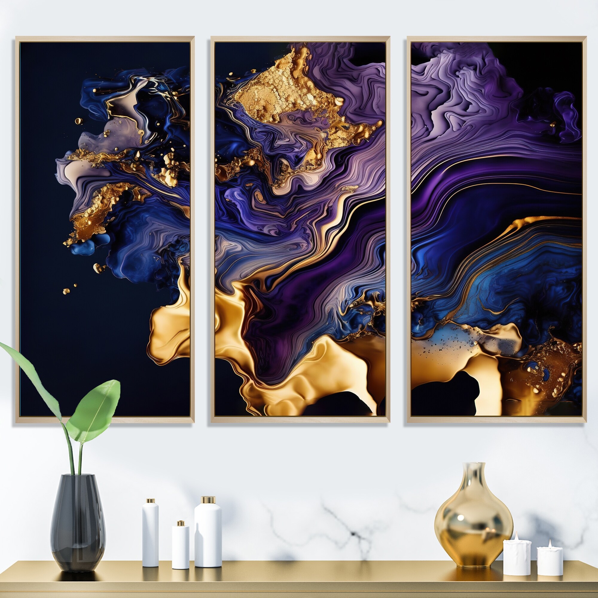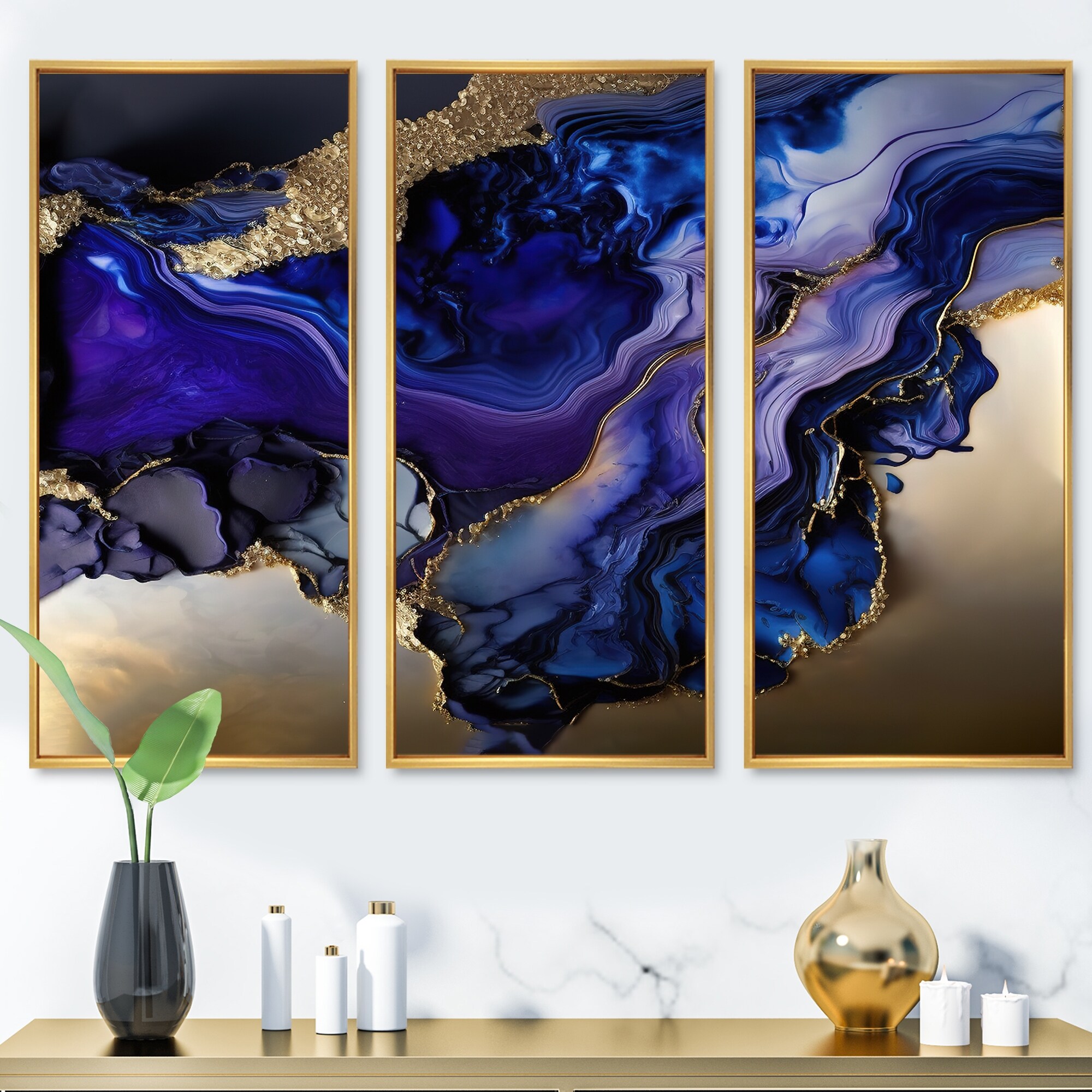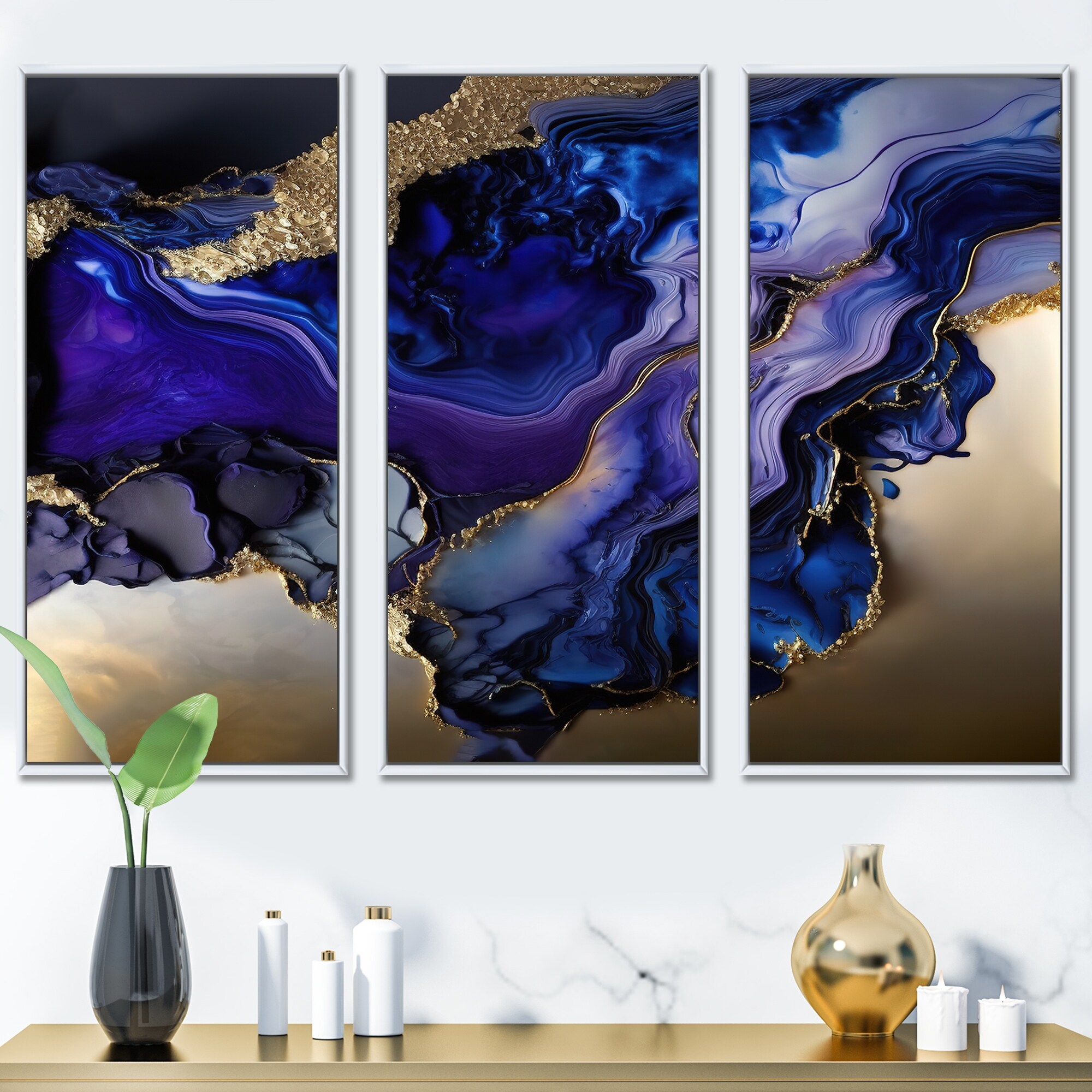 Designart "Abstract Marble Geode Purple And Blue" Abstract Liquid Ink Framed Canvas Art Print - 3 Panels