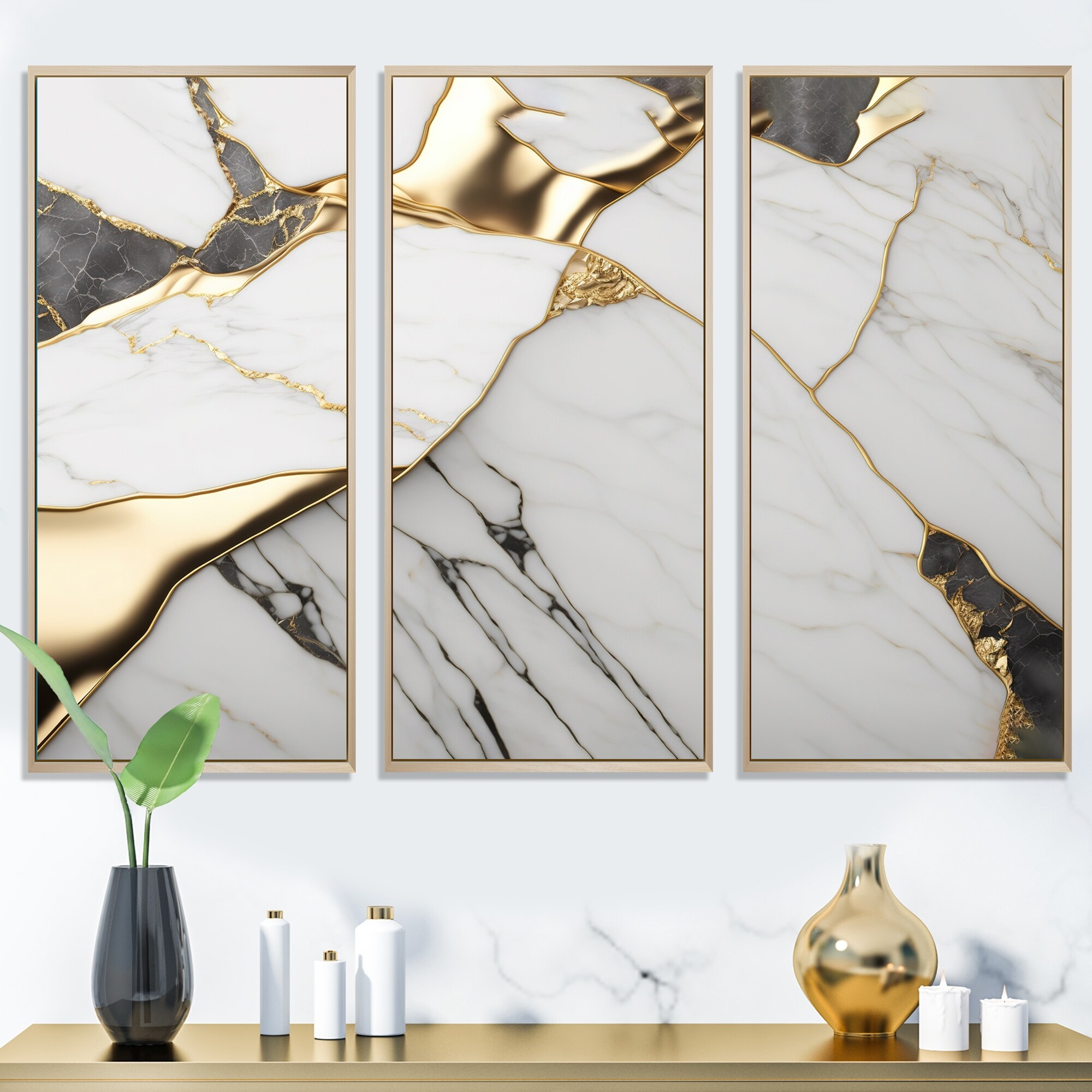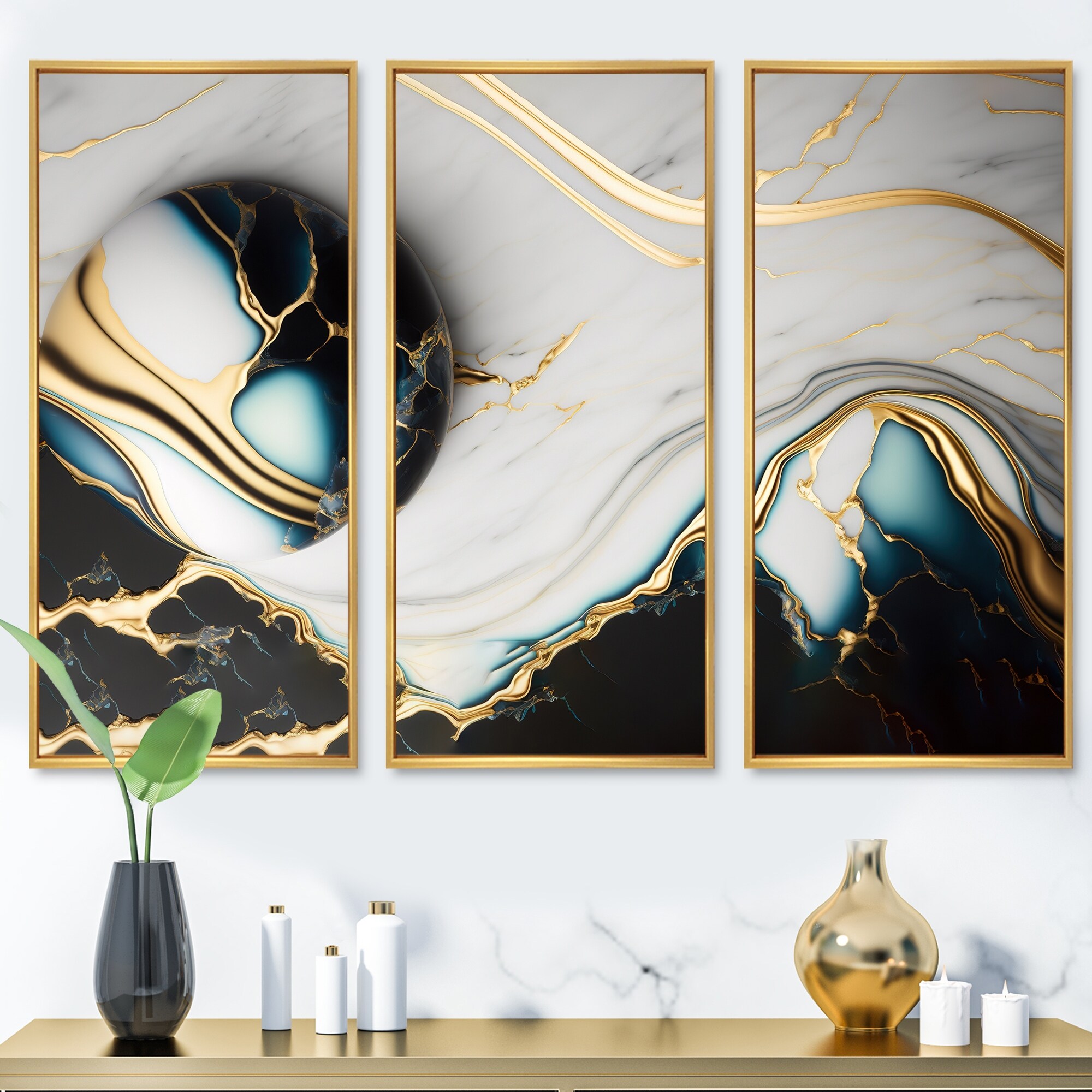 Designart "Abstract Geode Marble White And Gold I" Abstract Marble Framed Canvas Art Print - 3 Panels