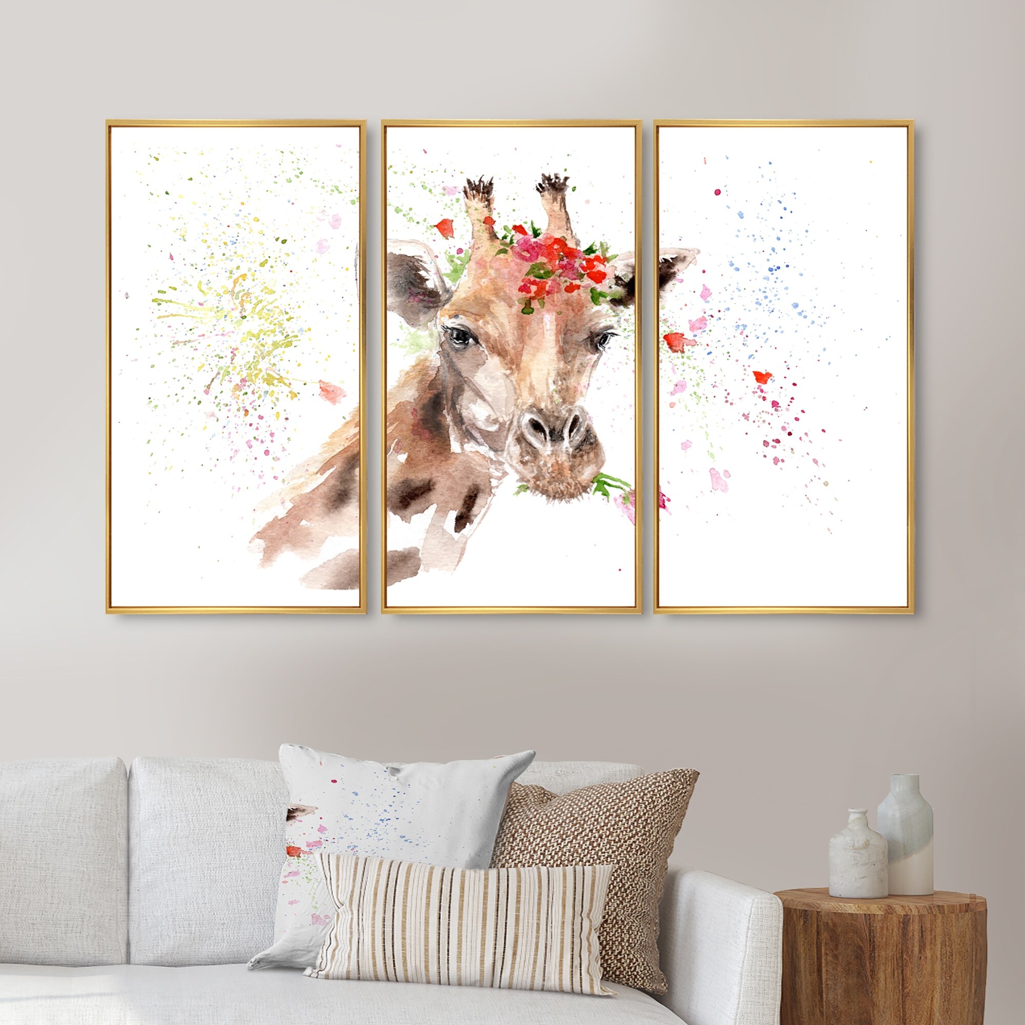 Designart "Portrait of a Giraffe With Flowers III" Farmhouse Framed Wall Art Set of 3 - 4 Colors of Frames