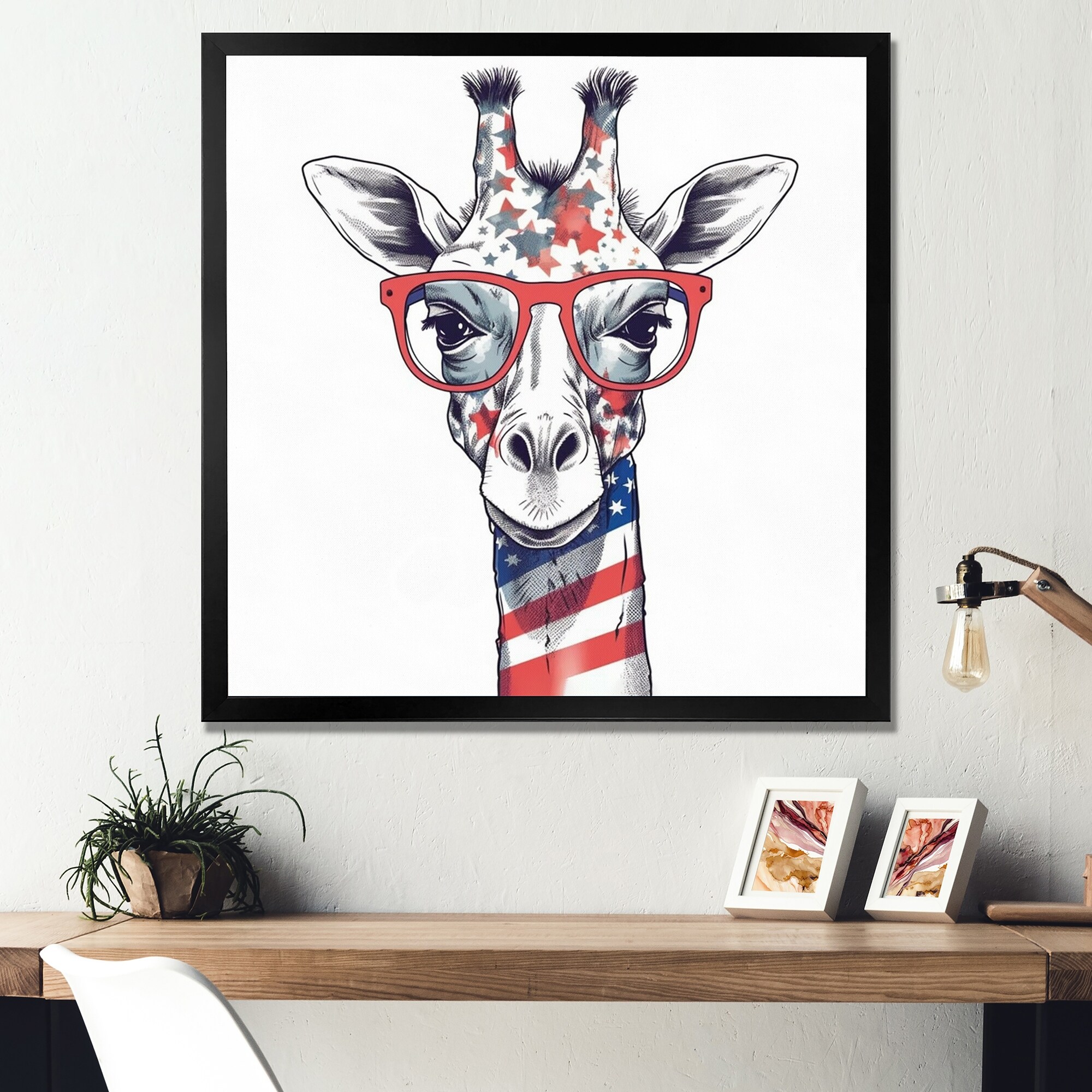 Designart "Red Blue Giraffe With Glasses" Animals Giraffe Framed Canvas Art Print