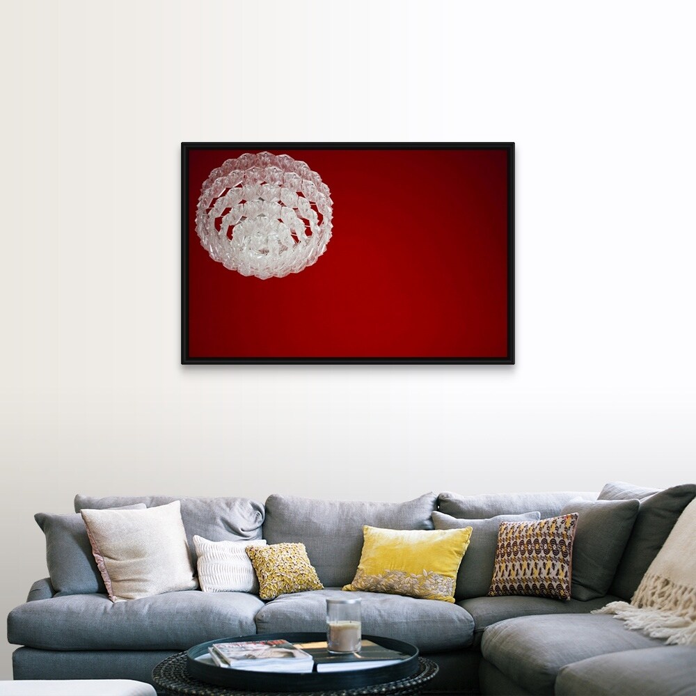 "A glass chandelier against a red ceiling" Black Float Frame Canvas Art