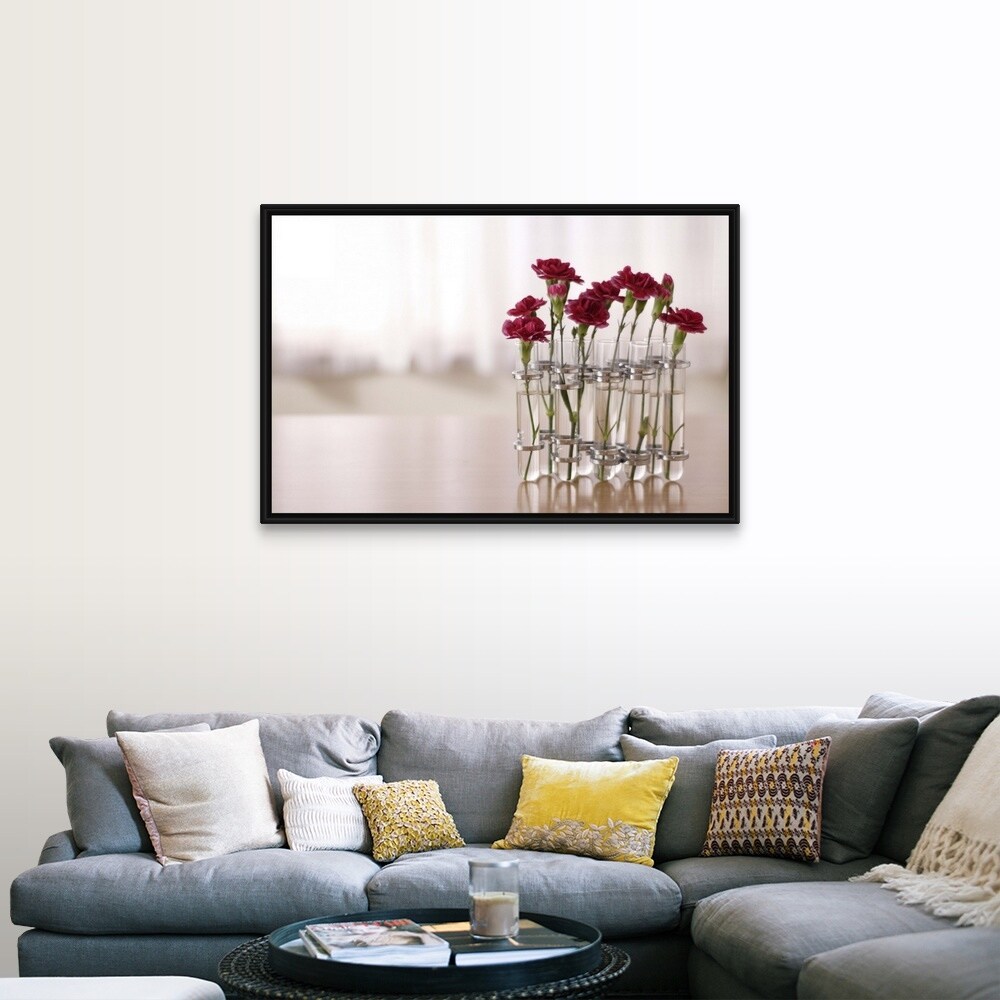 "Carnations flowers kept in glasses on table." Black Float Frame Canvas Art
