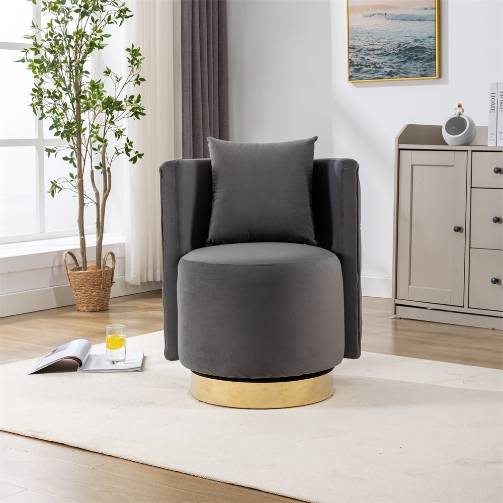 Swivel Tufted Back Accent Barrel Chair With Gold Metal Base and Throw Pillow