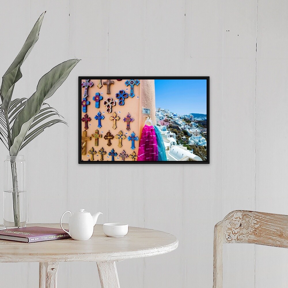 "Greece, Cyclades Islands, Santorini, Oia, Souvenirs outside shop" Black Float Frame Canvas Art