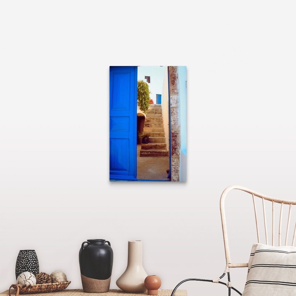 "A blue door leading up a stairwell in Greece" Canvas Wall Art