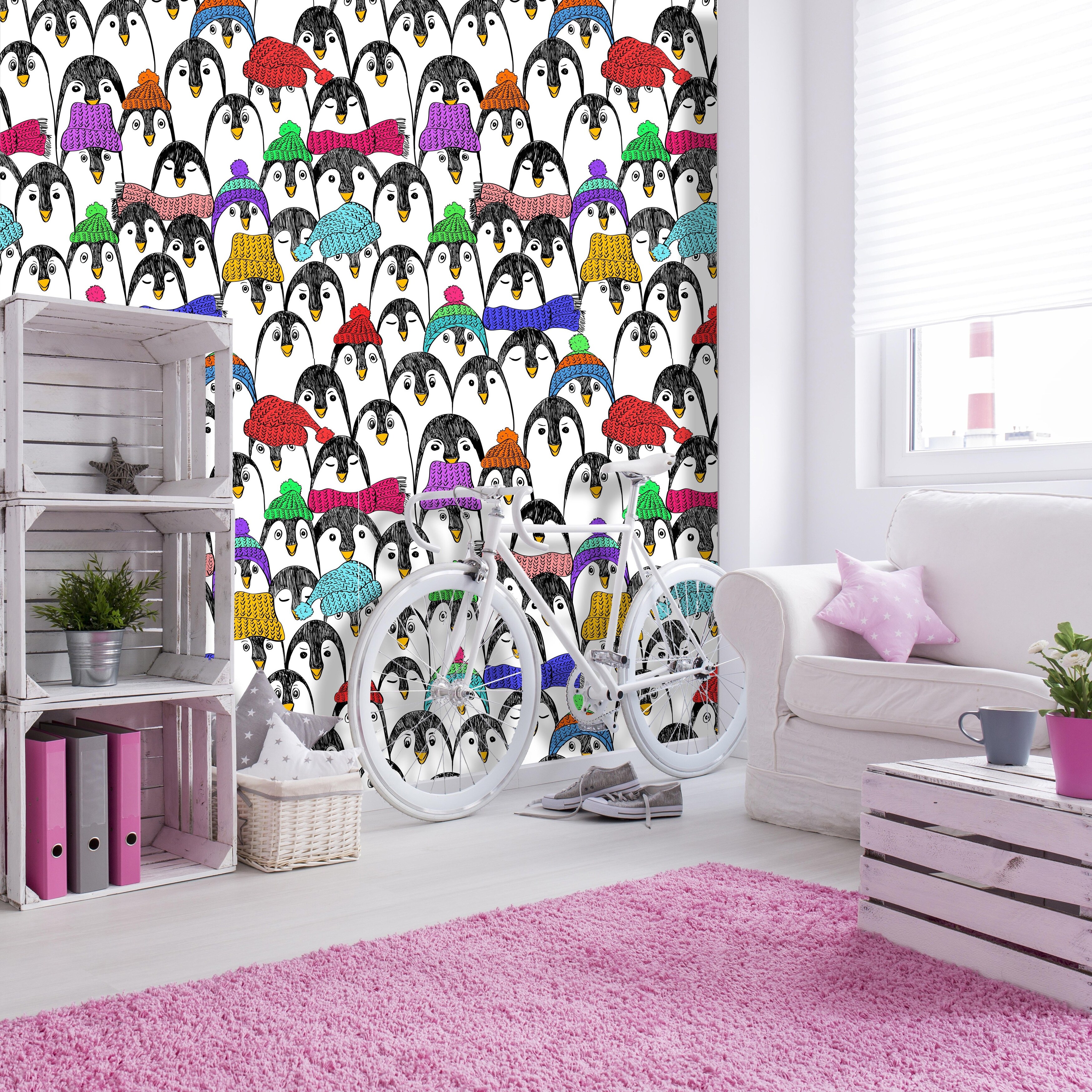 Penguins in Colorful Hats and Scarves Wallpaper
