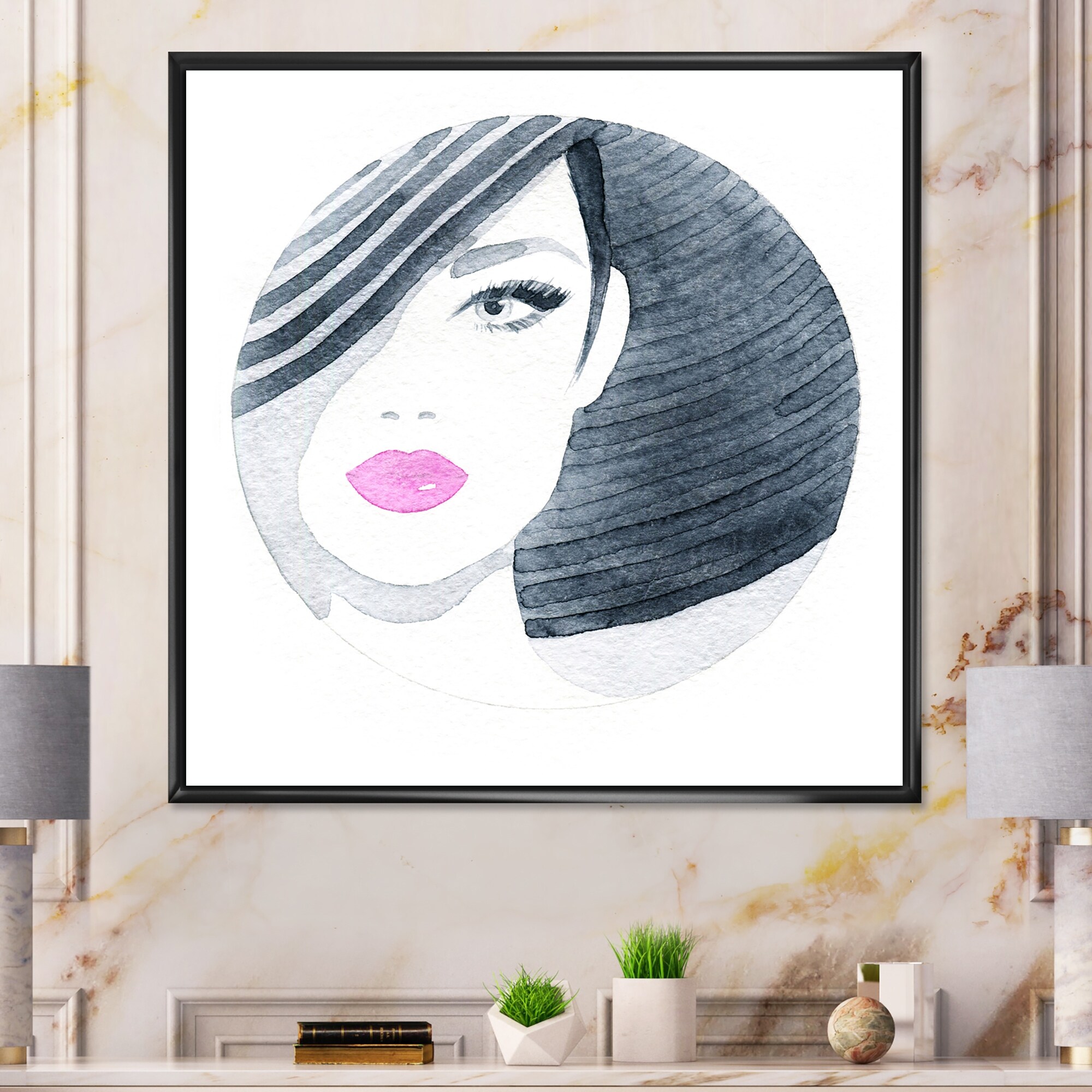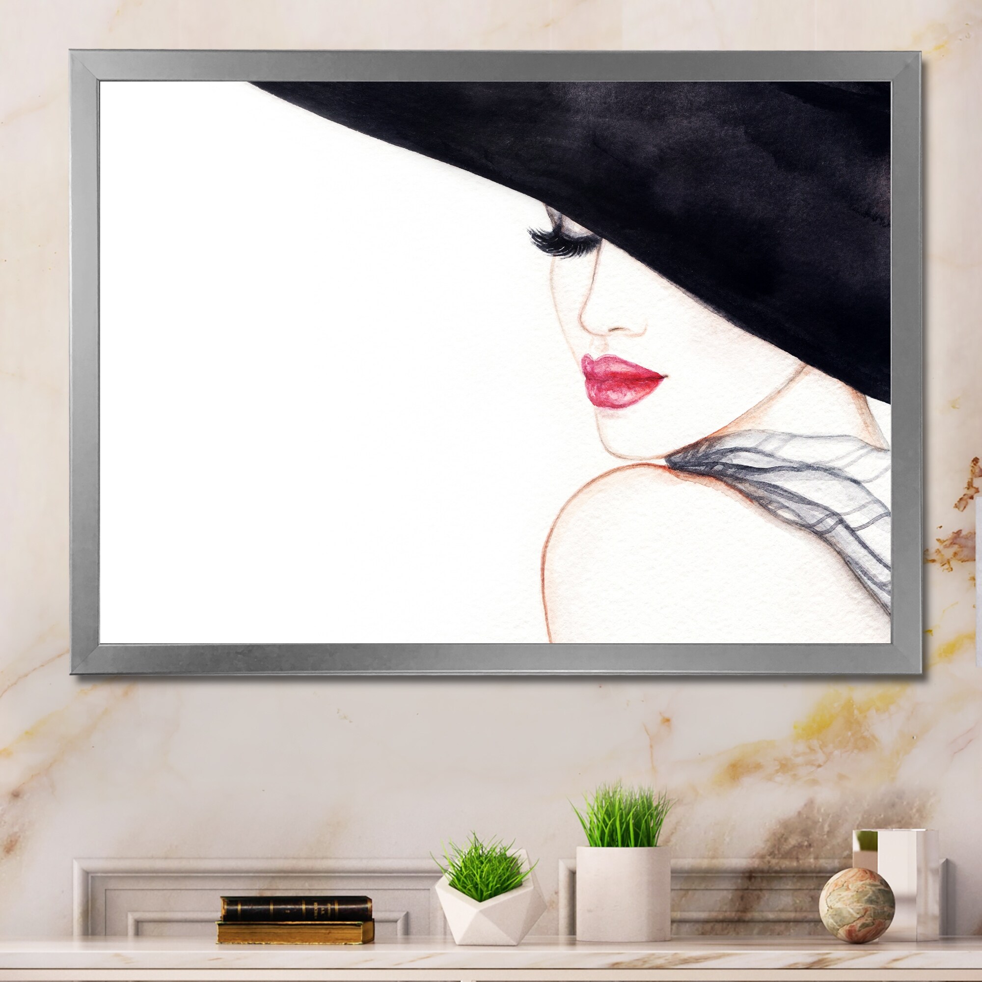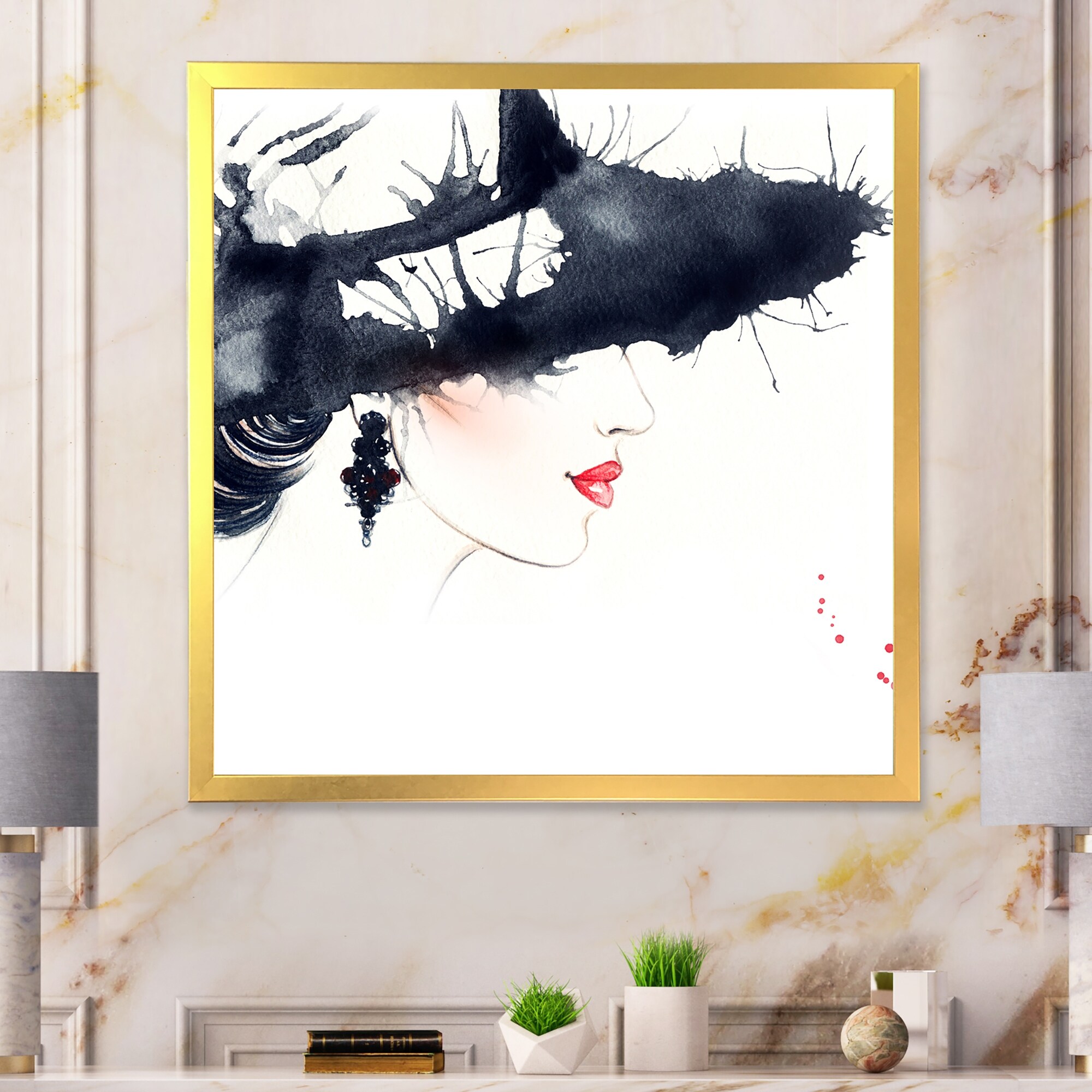Designart "Stylish Fashionista With Black Hat And Red Lips" Glam Framed artwork