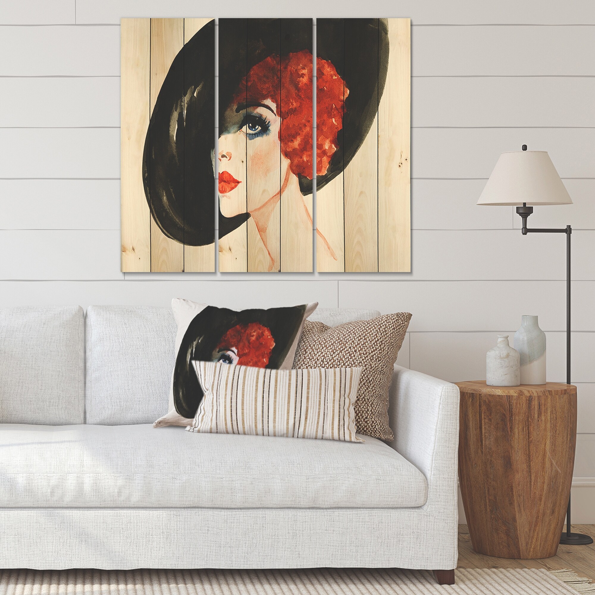 Designart 'Red Head Lady in Hat Portrait of Woman' Modern Print on Natural Pine Wood - 3 Panels