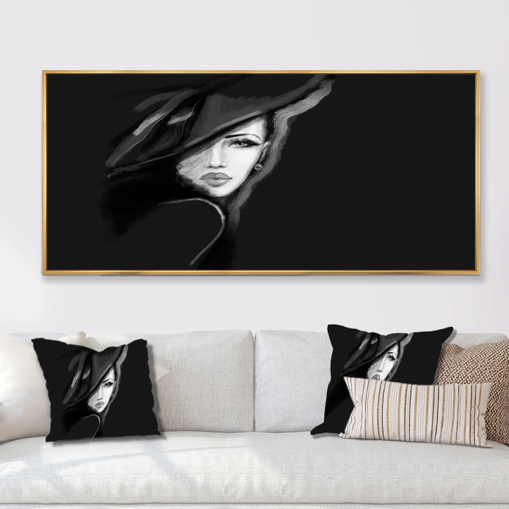Designart "Stylish Monochrome Fashionista With Black Hat" Fashion Framed Canvas artwork