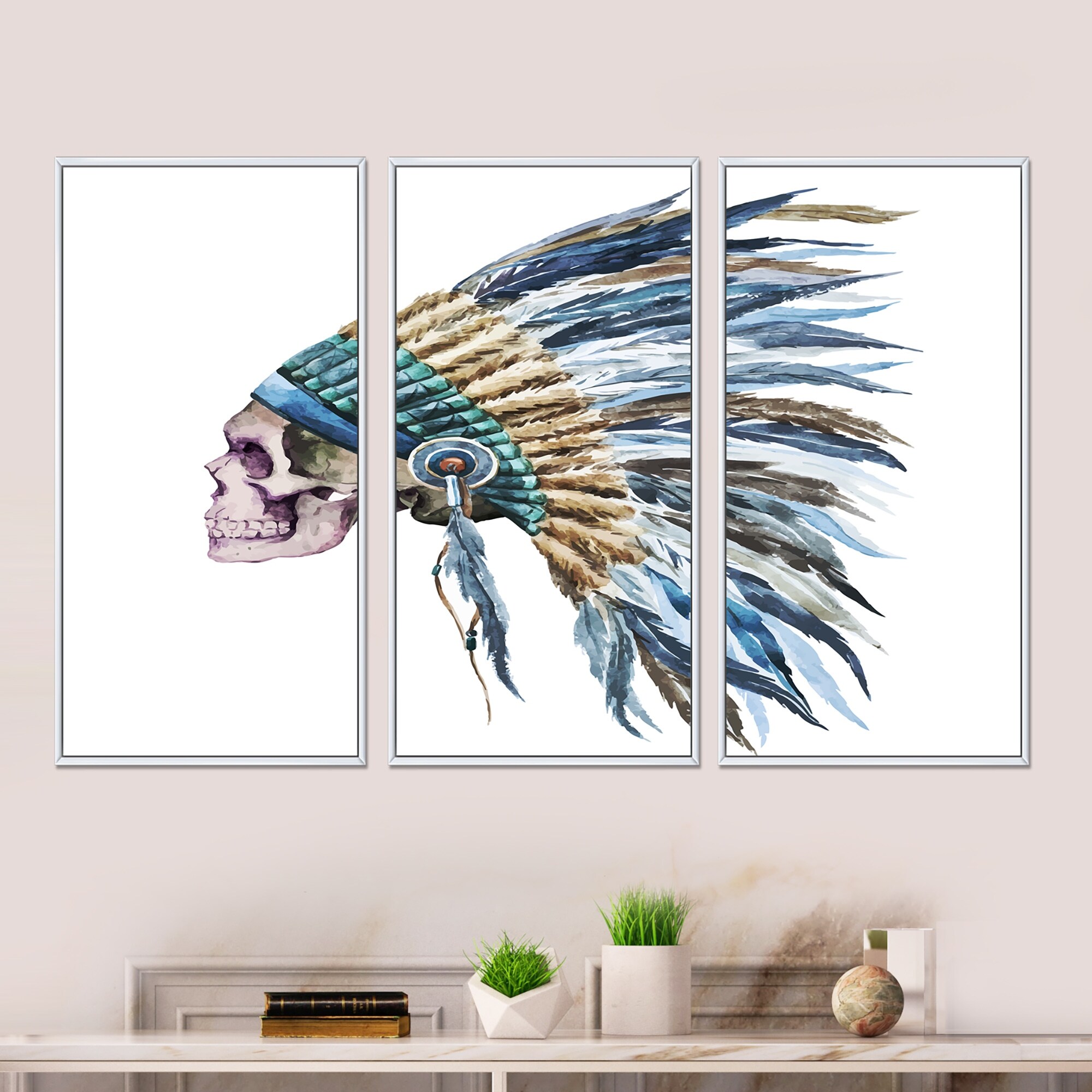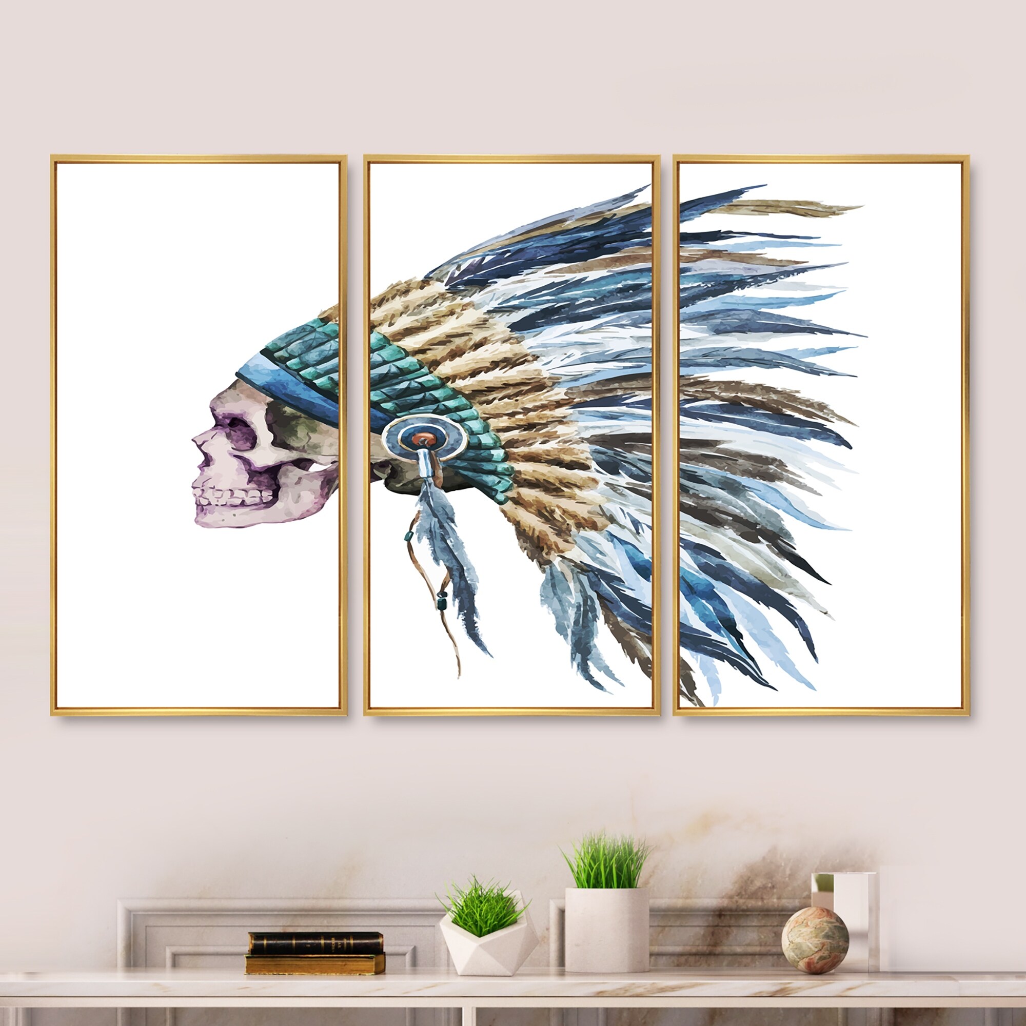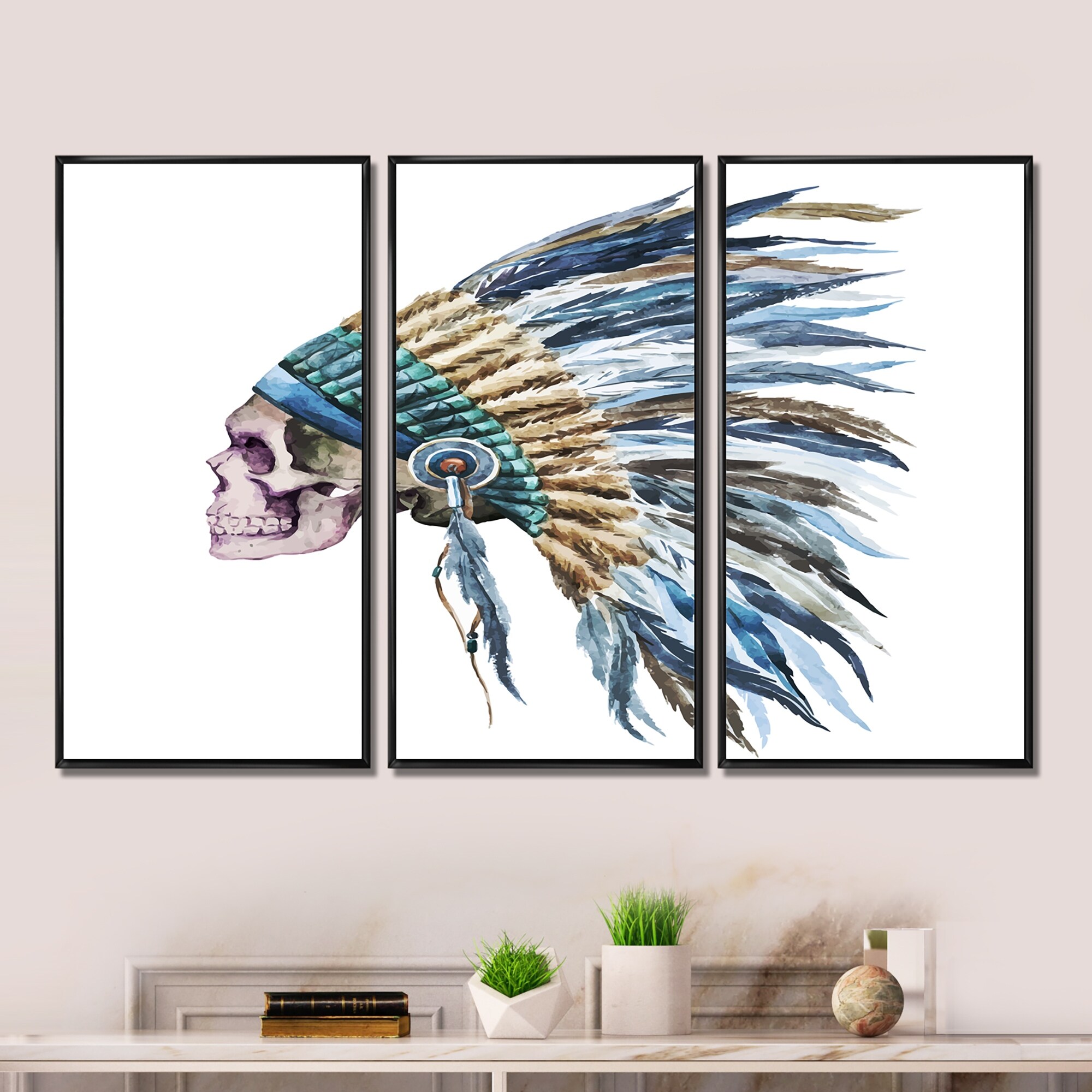 Designart "American Native Hat and Skull" Street Art Framed Wall Decor Set of 3 - 4 Colors of Frames