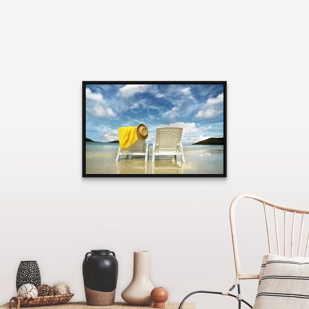 "Chairs on beach with towel and hat" Black Float Frame Canvas Art