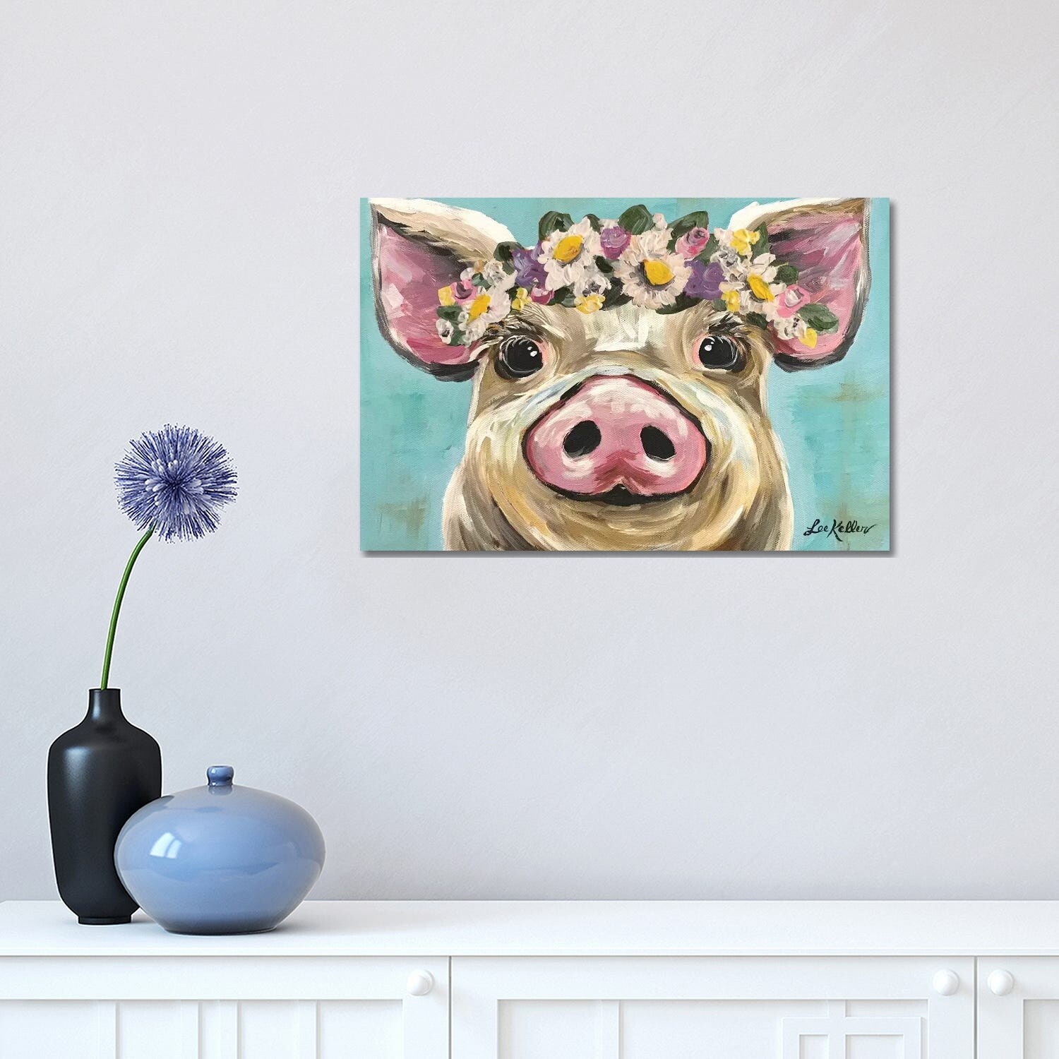 iCanvas "Pig With Flower Crown on Turquoise" by Hippie Hound Studios Canvas Print
