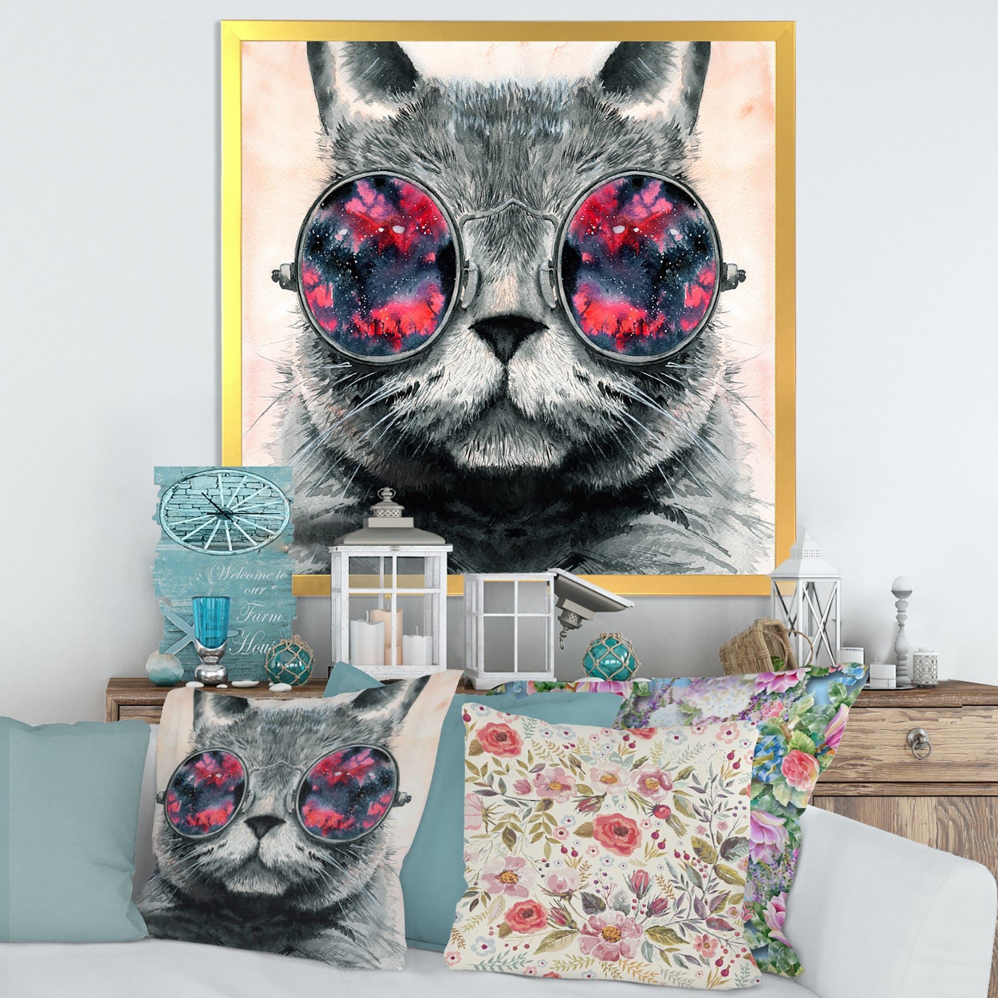 Designart "Grey Fluffy Cat in Round Hippie Glasses III" Modern Framed Art Print
