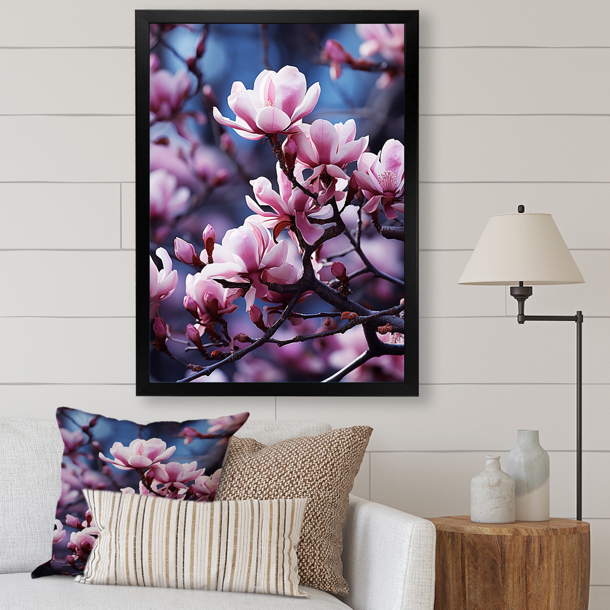 Designart "Purple Magnolias Mystic Magnolias Black" Magnolias Framed Wall Decor