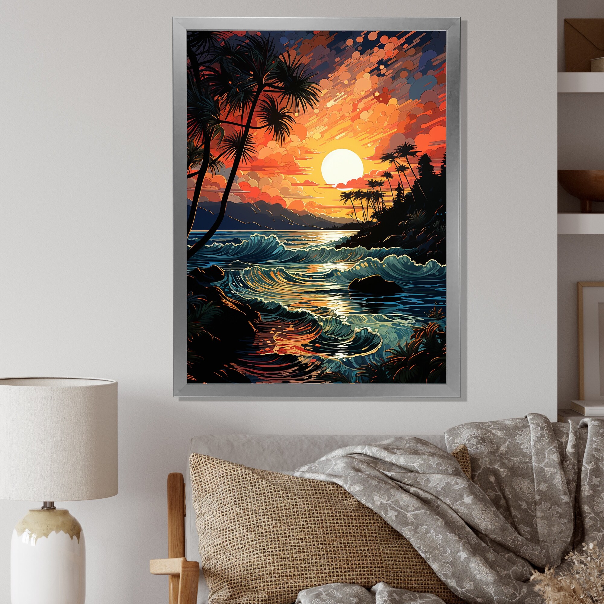 Designart "Colorful Orange Palm Trees Sunset IV" Palms & Palm Trees Framed Canvas Print
