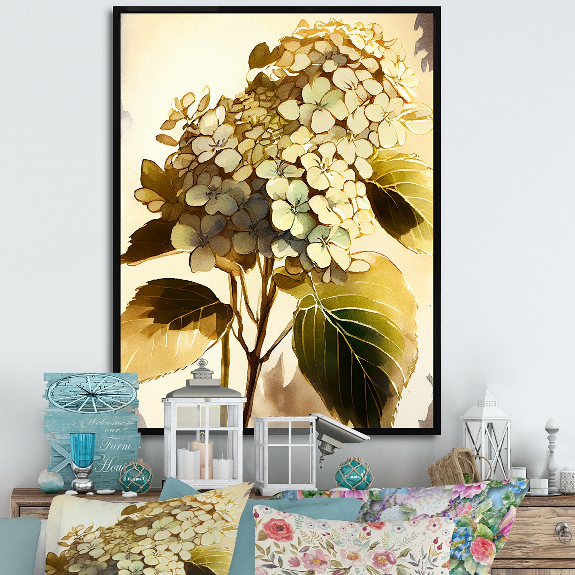 Designart "Pink Hydrangena V" Floral Framed Canvas Wall Art Print