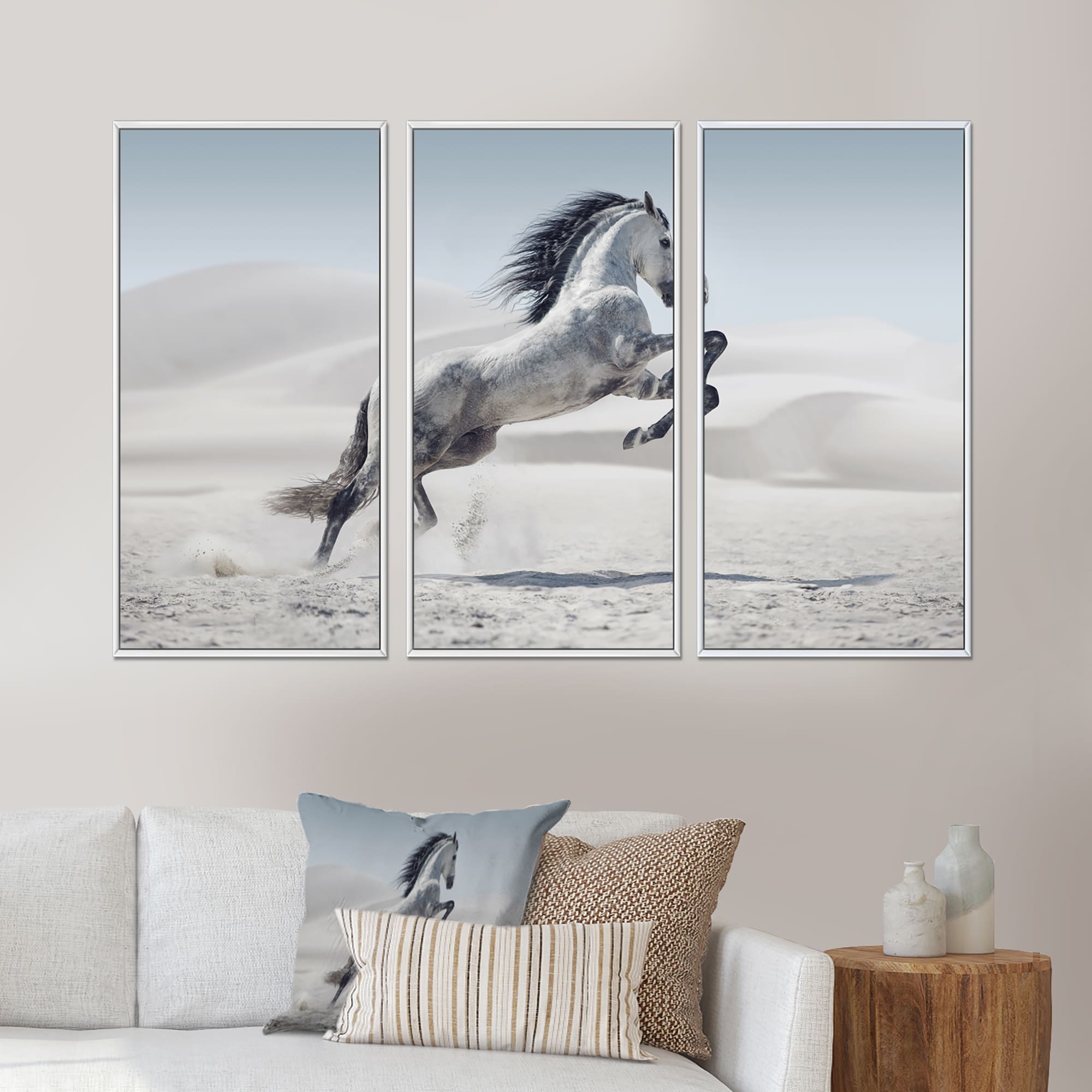 Designart "Galloping White Horse" Animal Framed Canvas Wall Art Set of 3 - 4 Colors of Frames