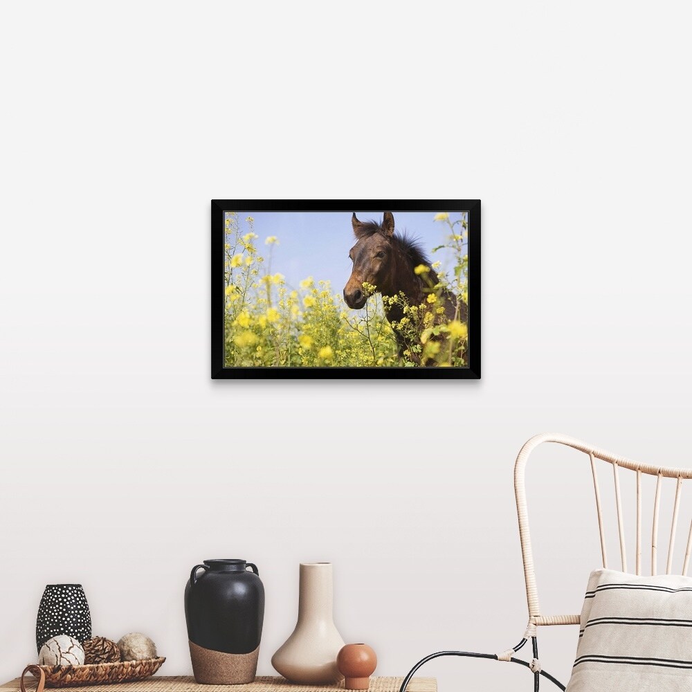 "Portrait of brown horse on flower meadow" Black Framed Print