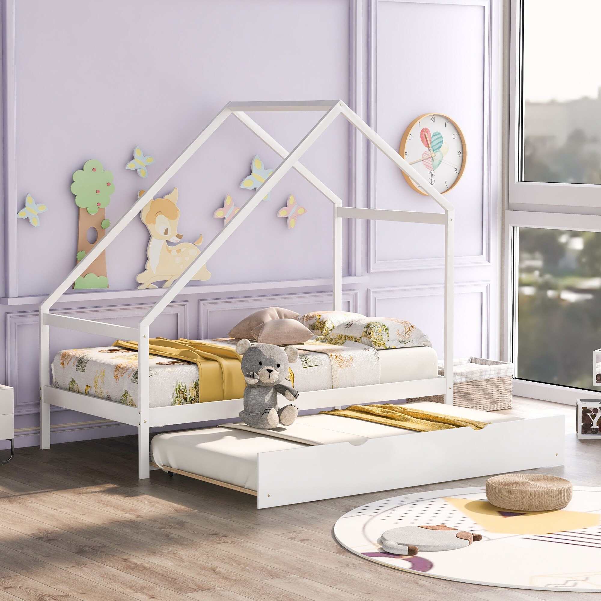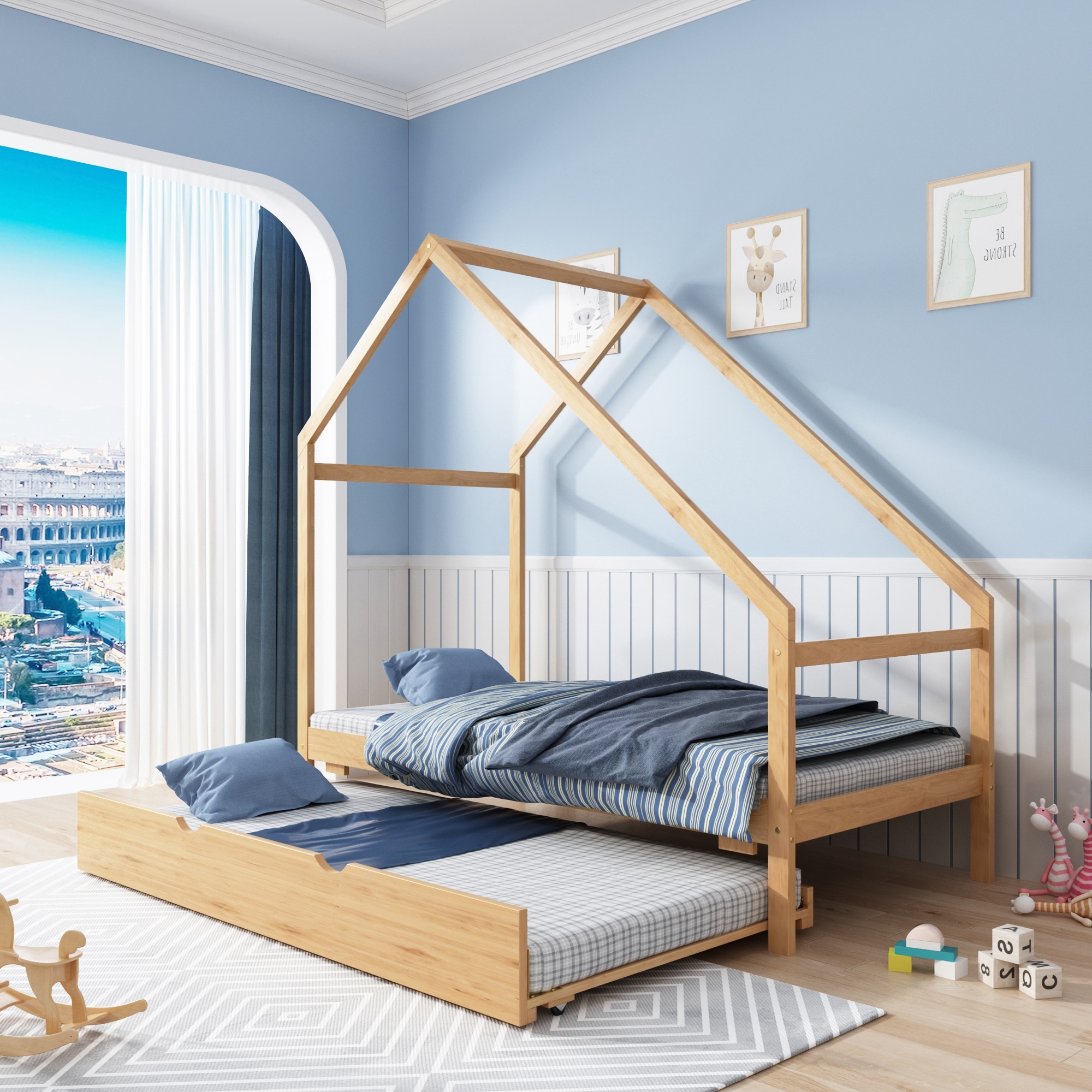 Whimsical House Bed, Twin Size Wooden House Bed with Trundle, Solid Pine Construction