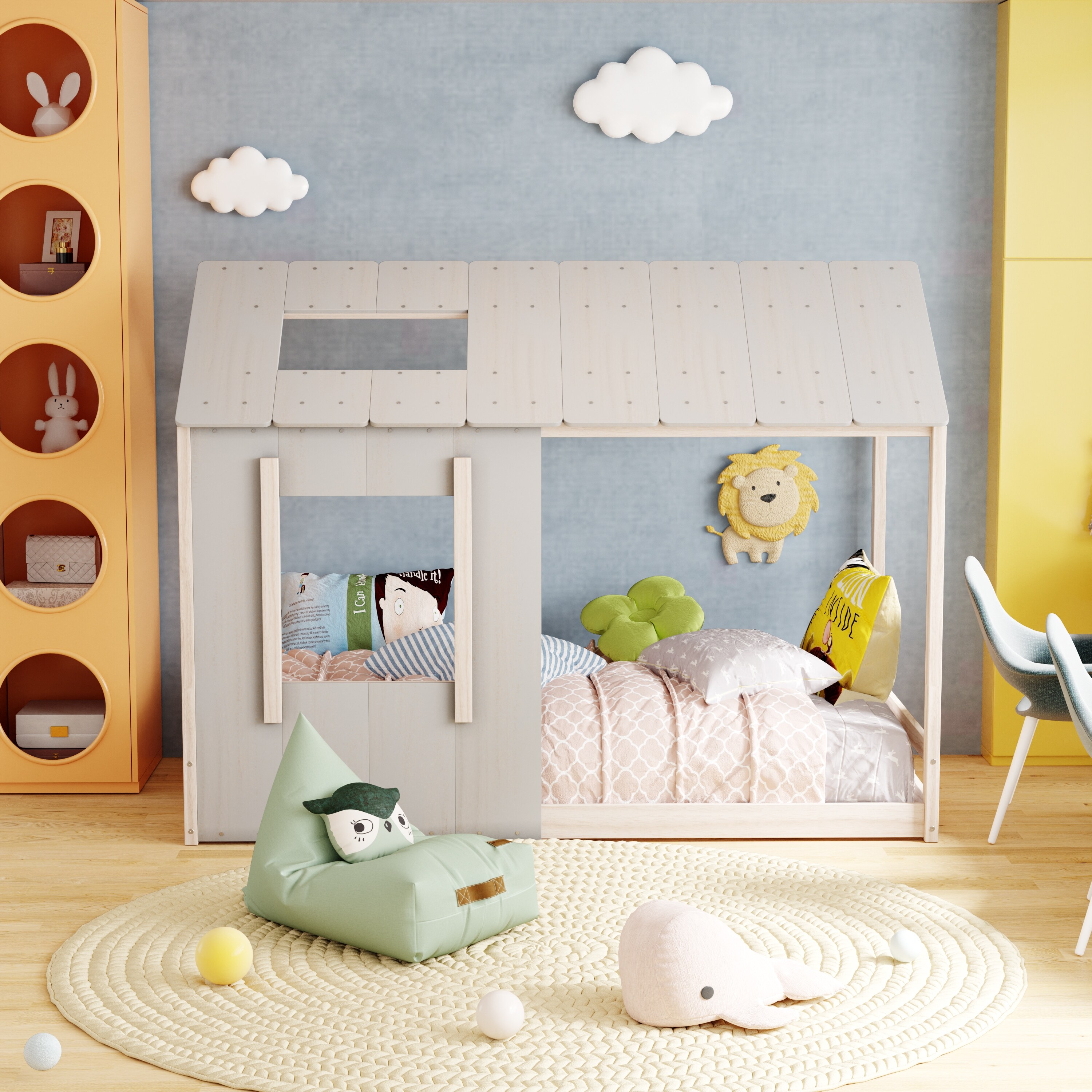 Twin Size Floor Wooden Bed with House Roof Frame And Fence Guardrails, Easy Assembly (Thickness Less Than 6 Inches Is Suggested)