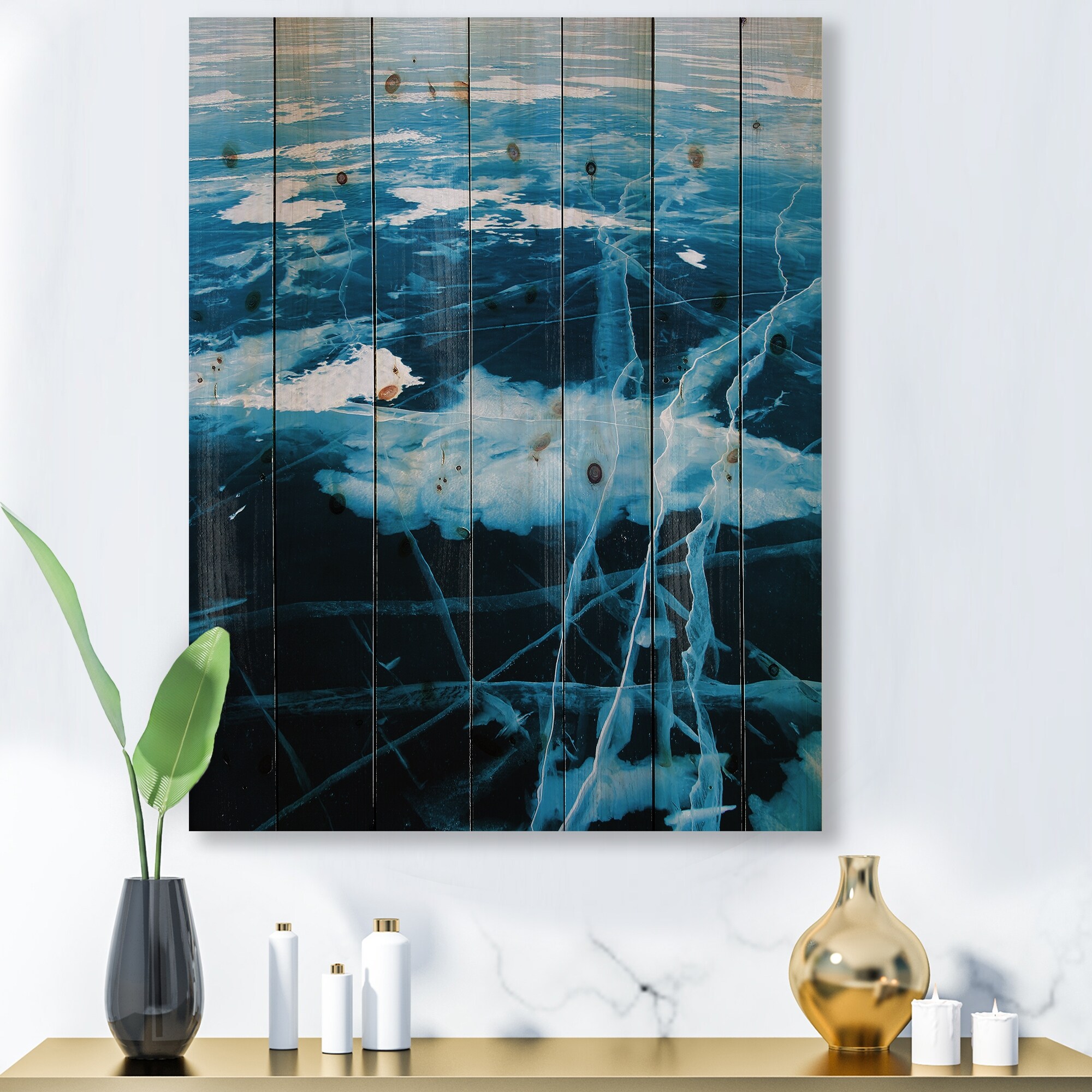 Designart 'Blue and White Ice Structure I' Modern Print on Natural Pine Wood