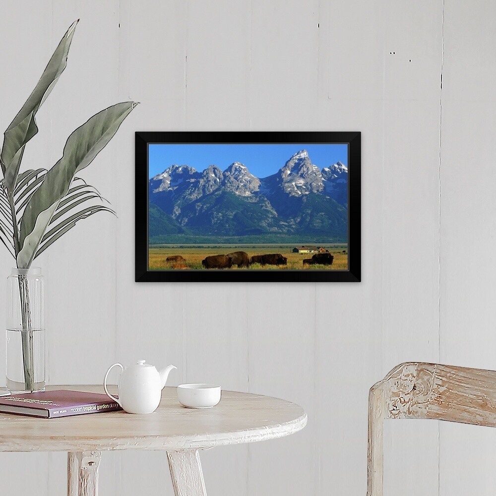 "Teton Range overlooking bisons grazing at Jackson Hole, Wyoming" Black Framed Print