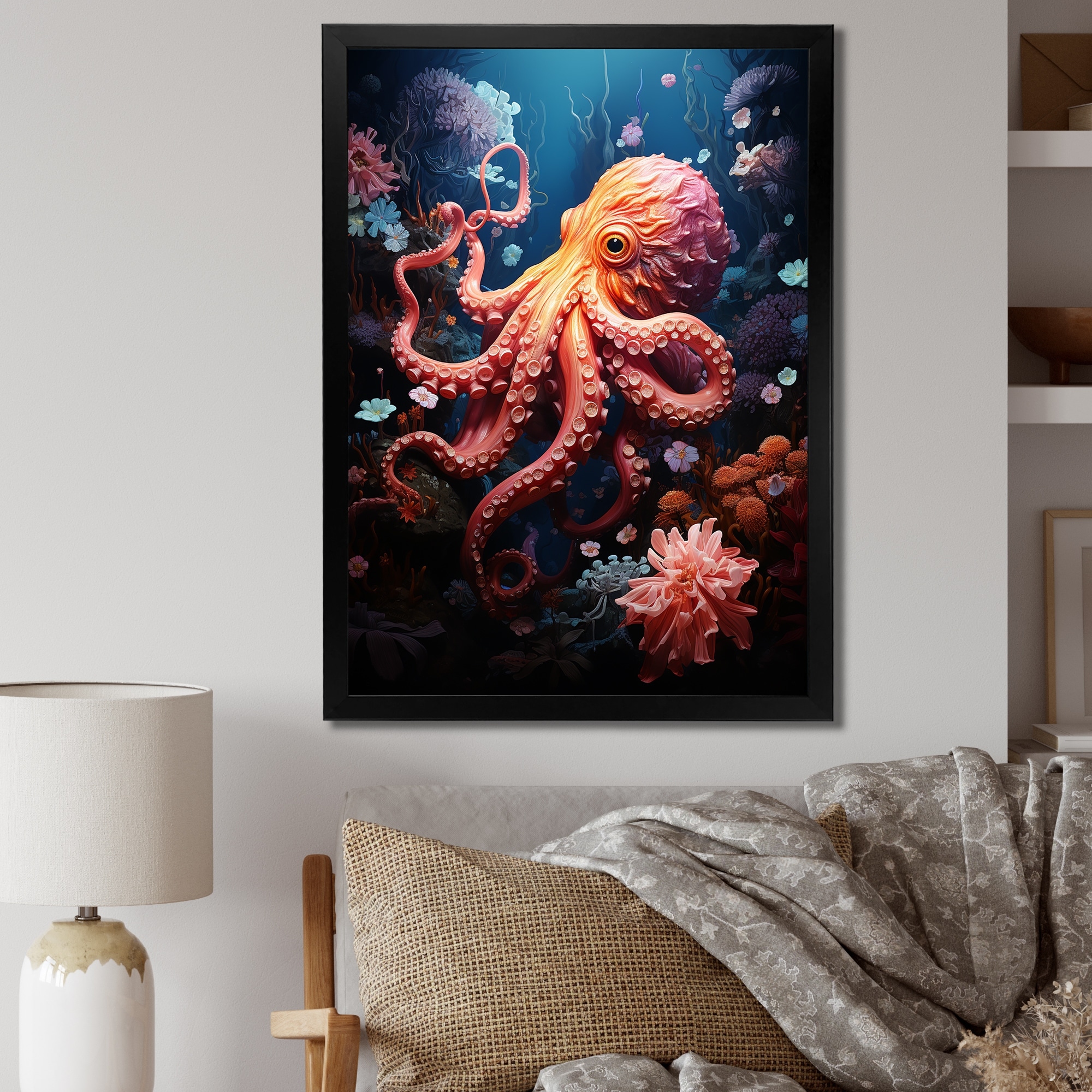 Designart "Coral Teal Octopus Dance" Marine Animals Framed Canvas Print