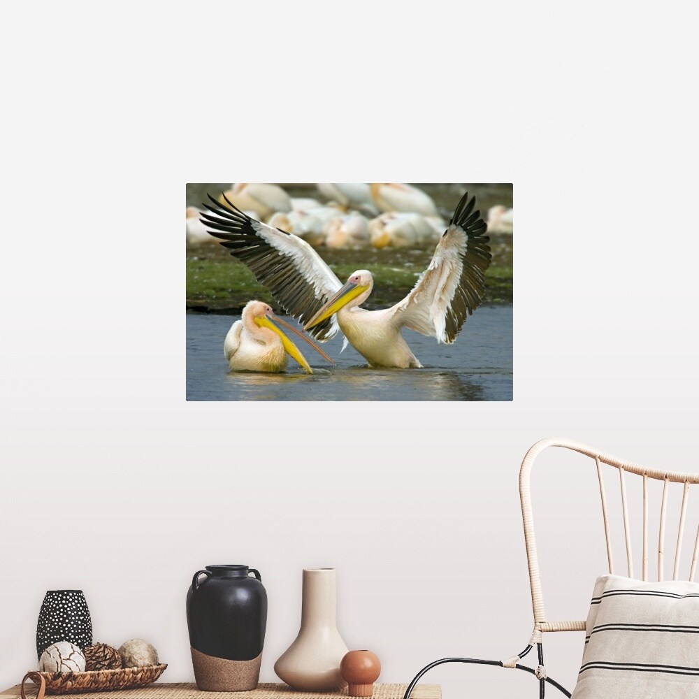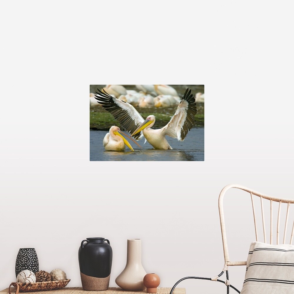 "Two Great white pelicans wading in a lake, Lake Nakuru, Kenya (Pelecanus onocrotalus)" Poster Print