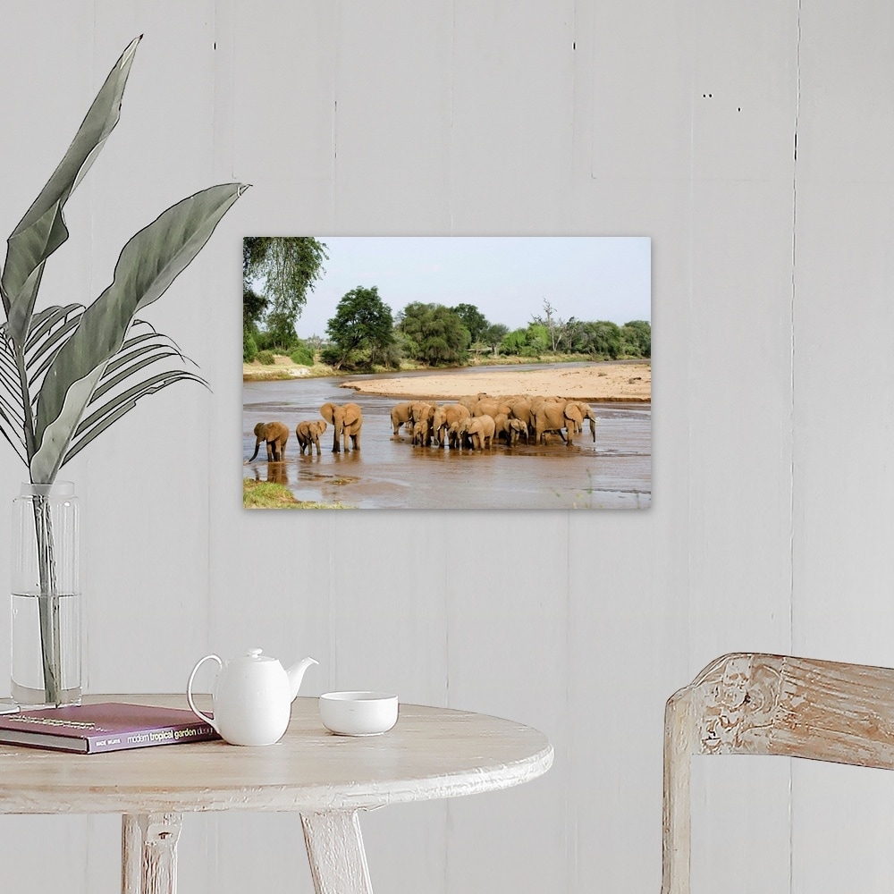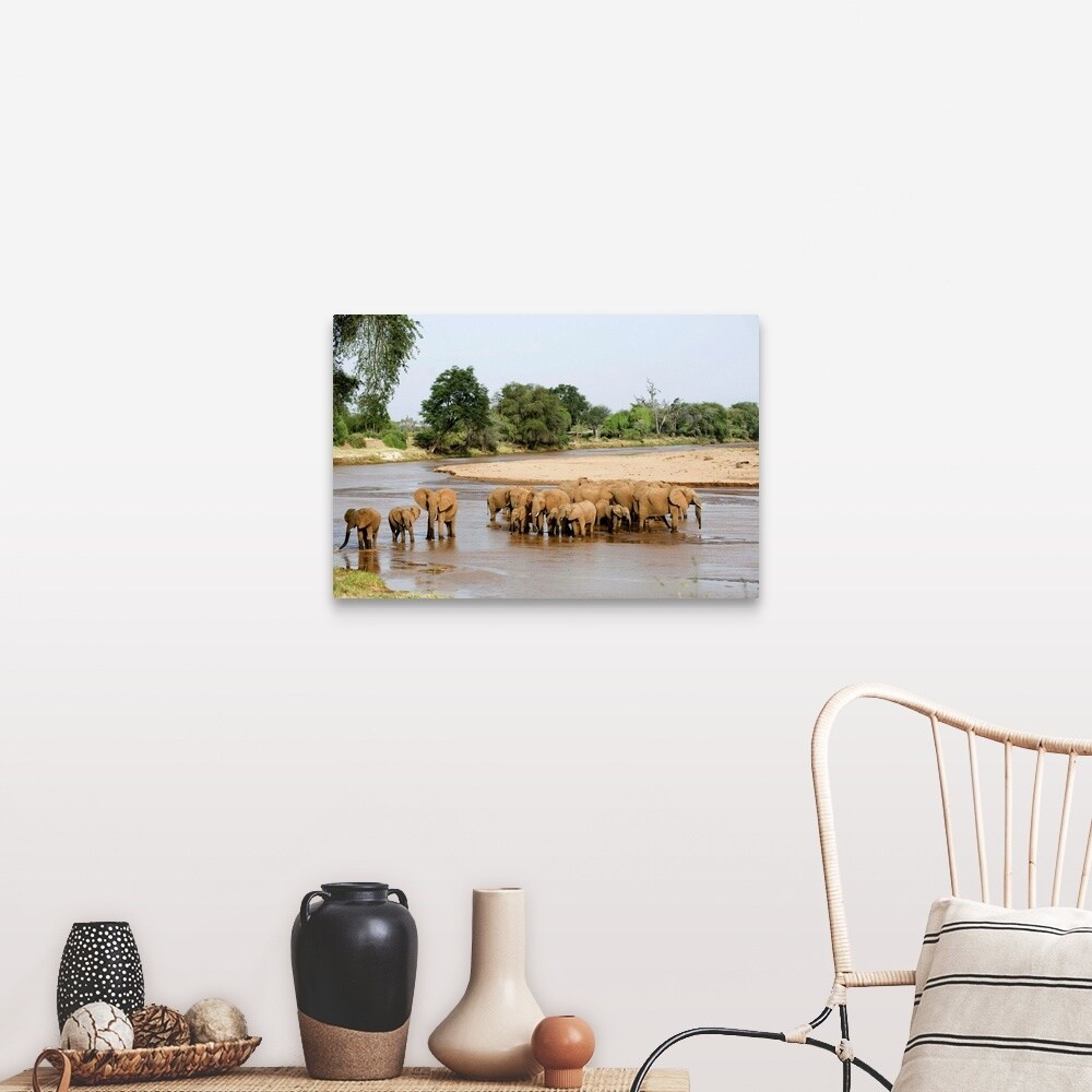 "Herd of African elephants crossing the river, Samburu National Park, Kenya" Canvas Wall Art