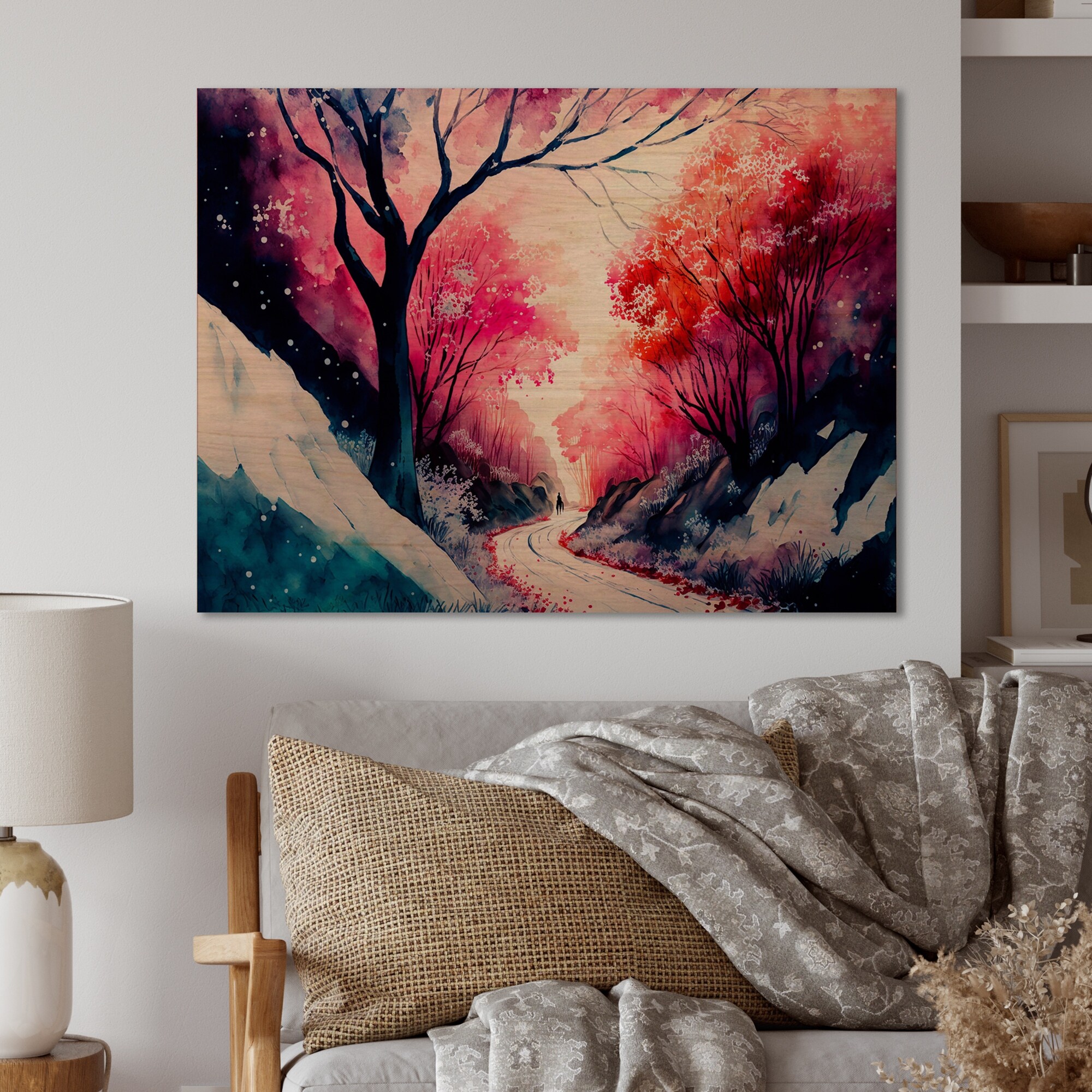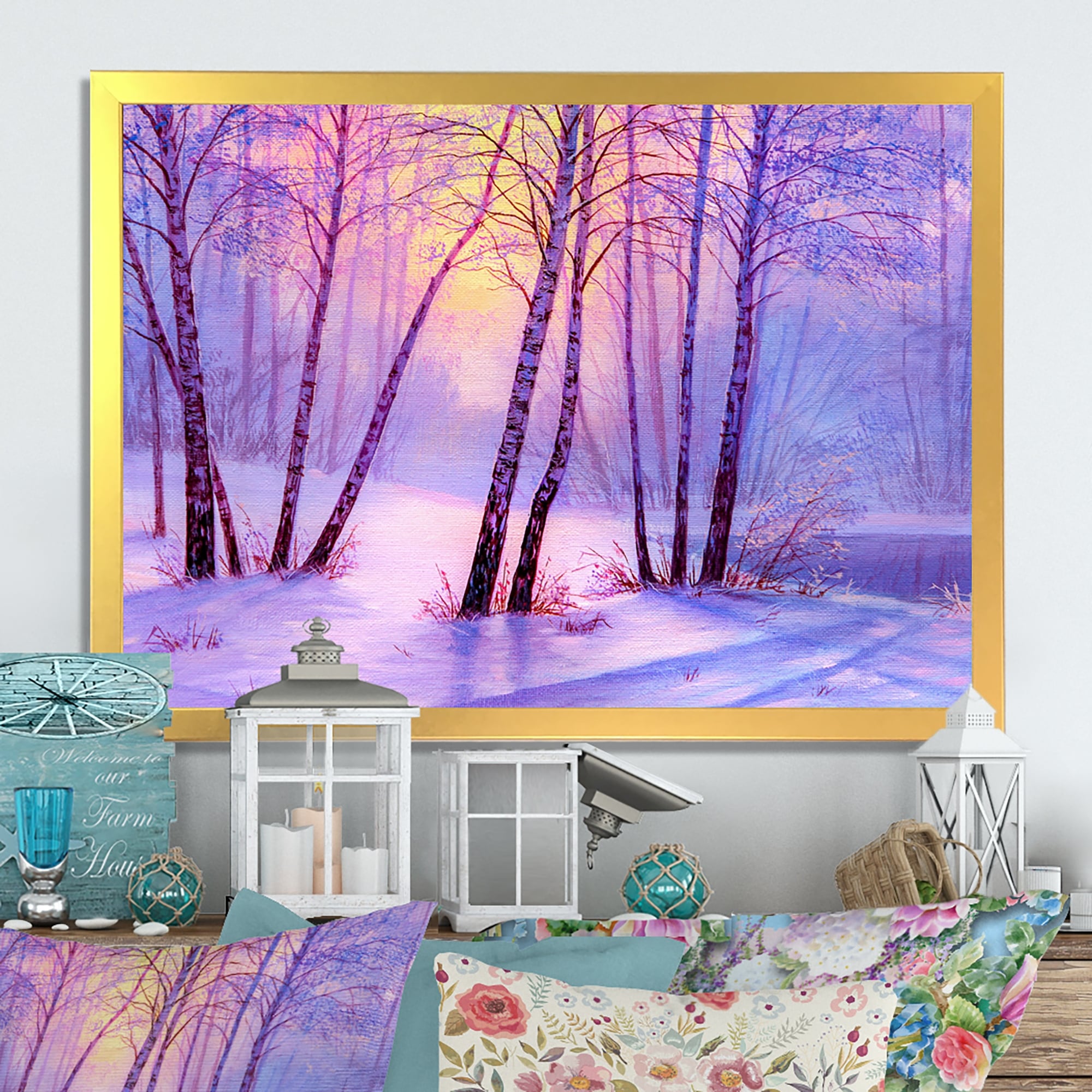 Designart 'Winter Beauty Landscape in Pink Magenta And Blue V' Landscape Forest Wood Wall Art - Natural Pine Wood