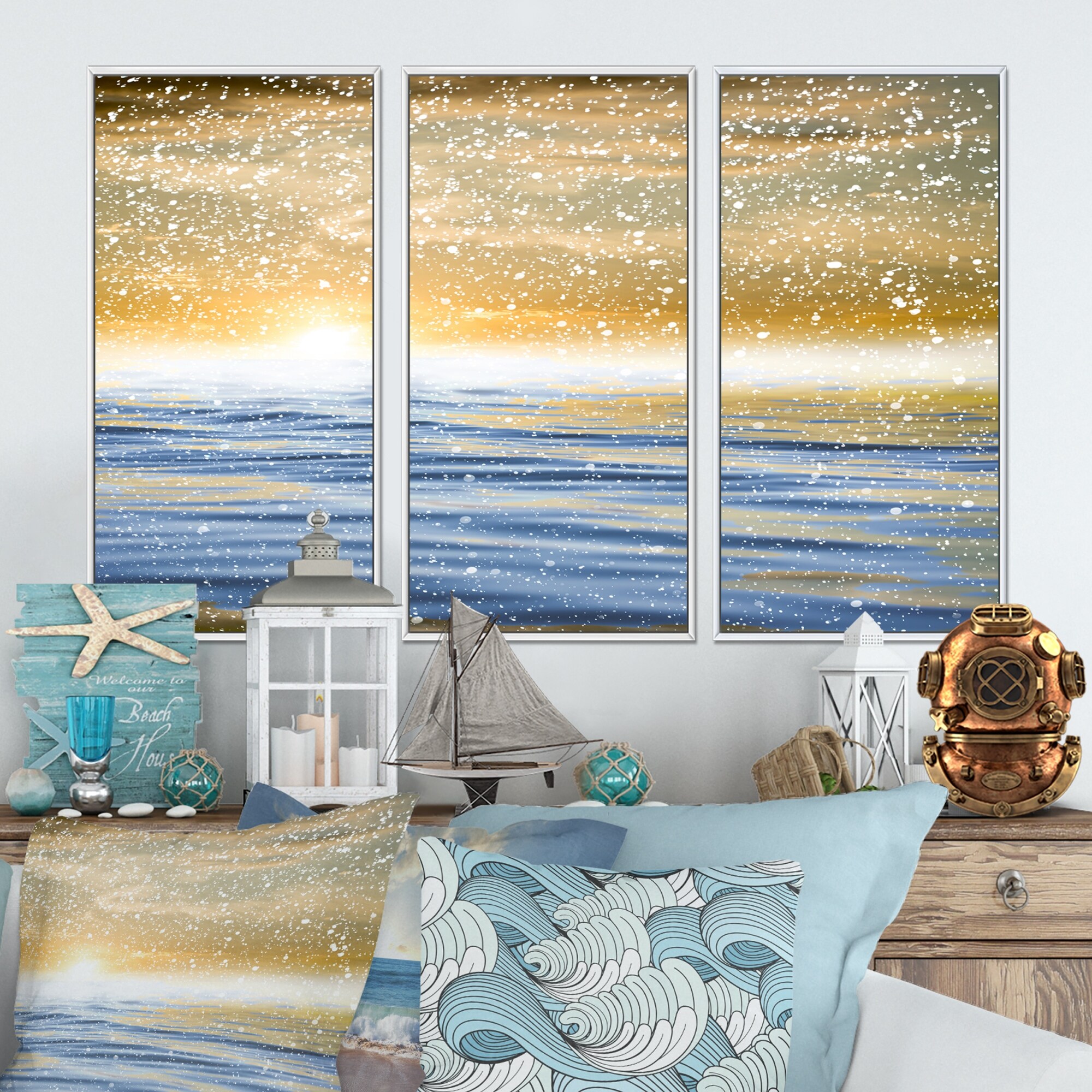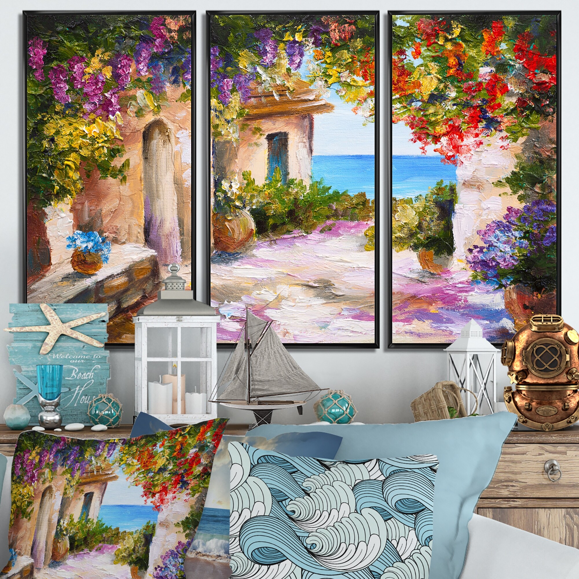 Designart "Summer Seascape" Landscape Framed Art Set of 3 - 4 Colors of Frames