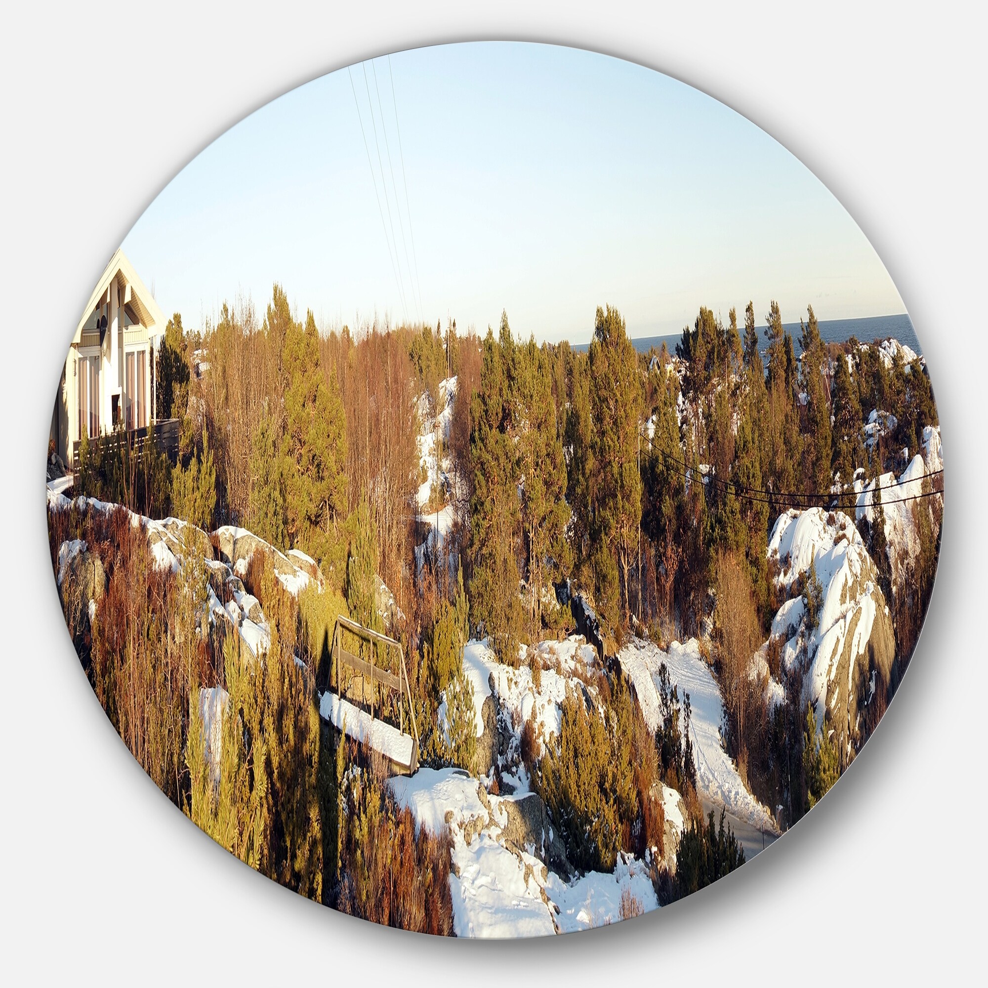 Designart 'Rocky Coast with Wooden Cottage' Landscape Circle Wall Art